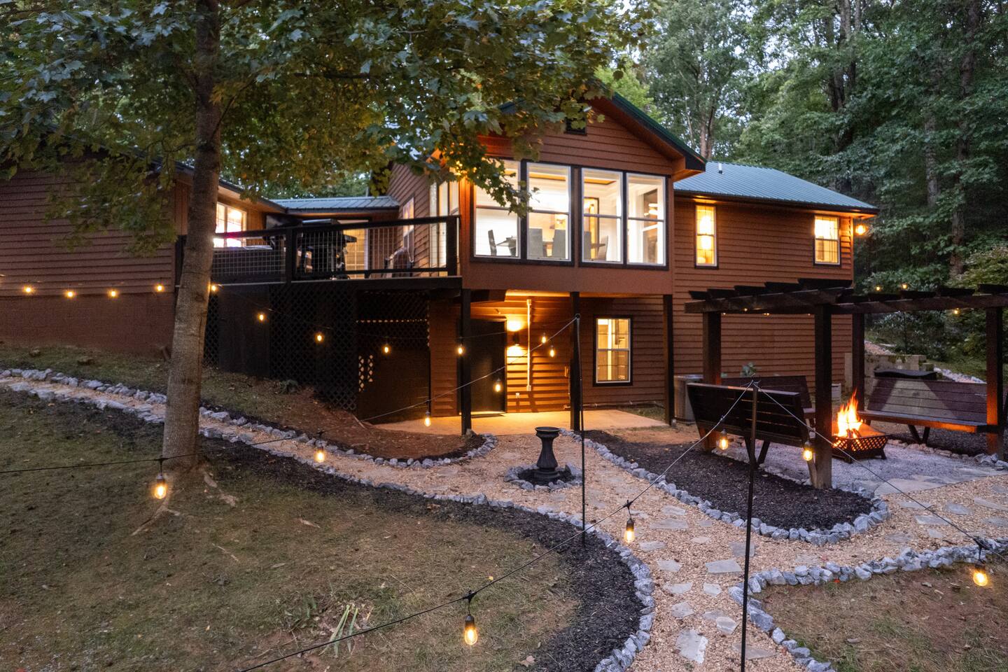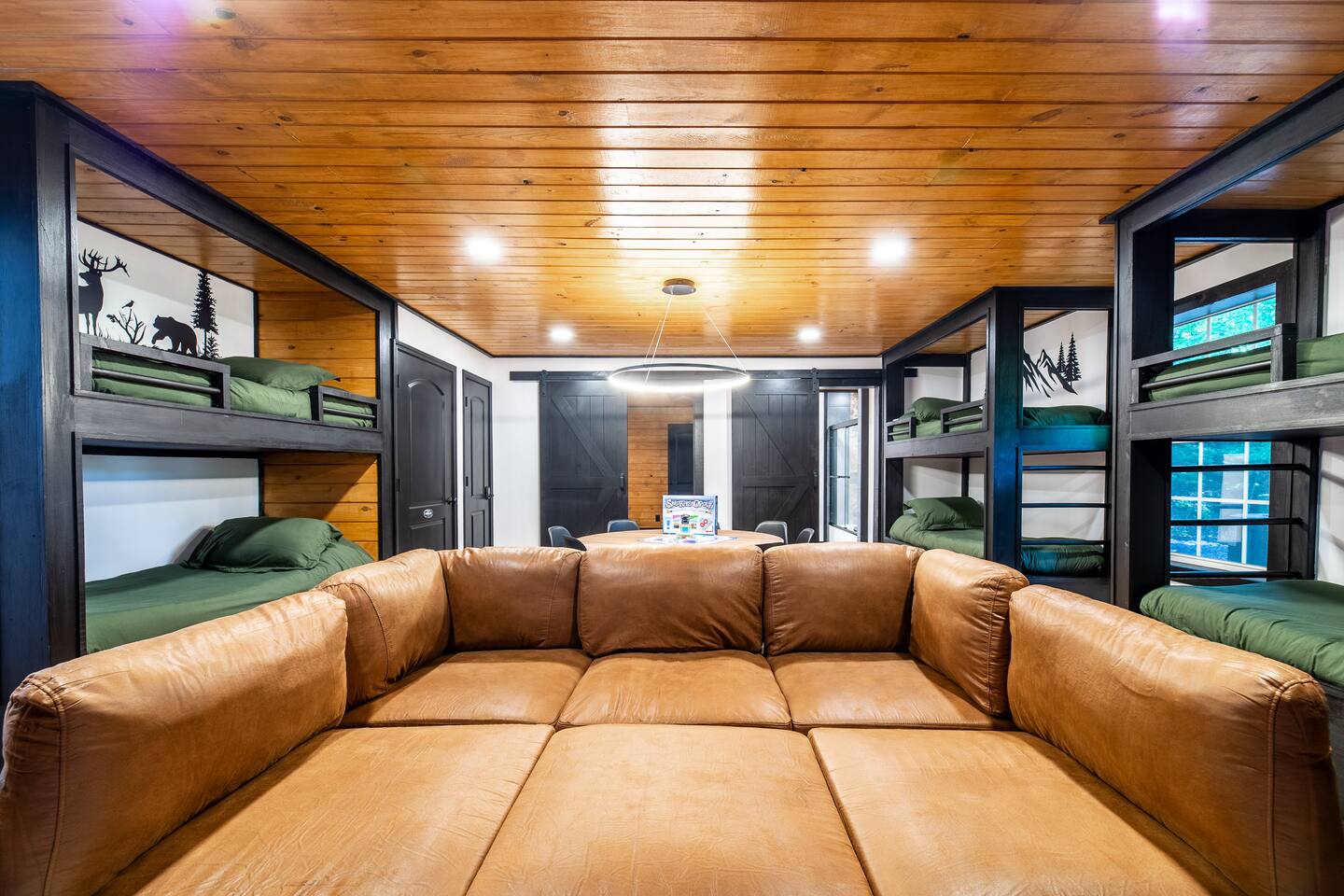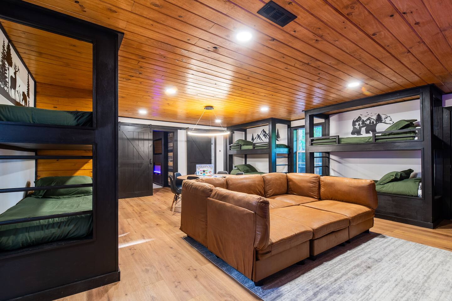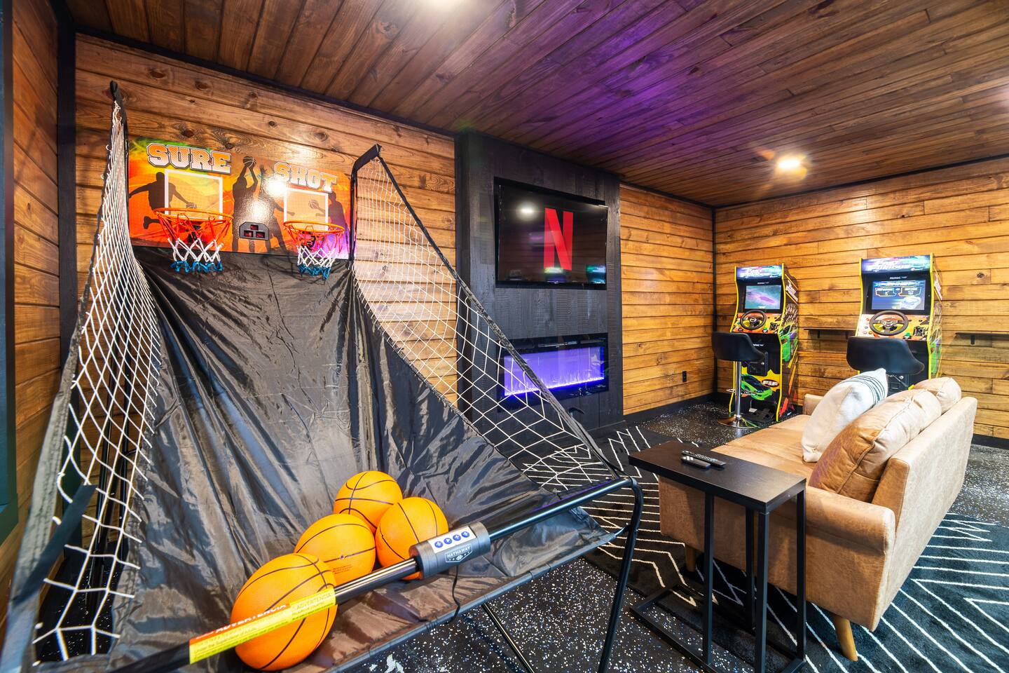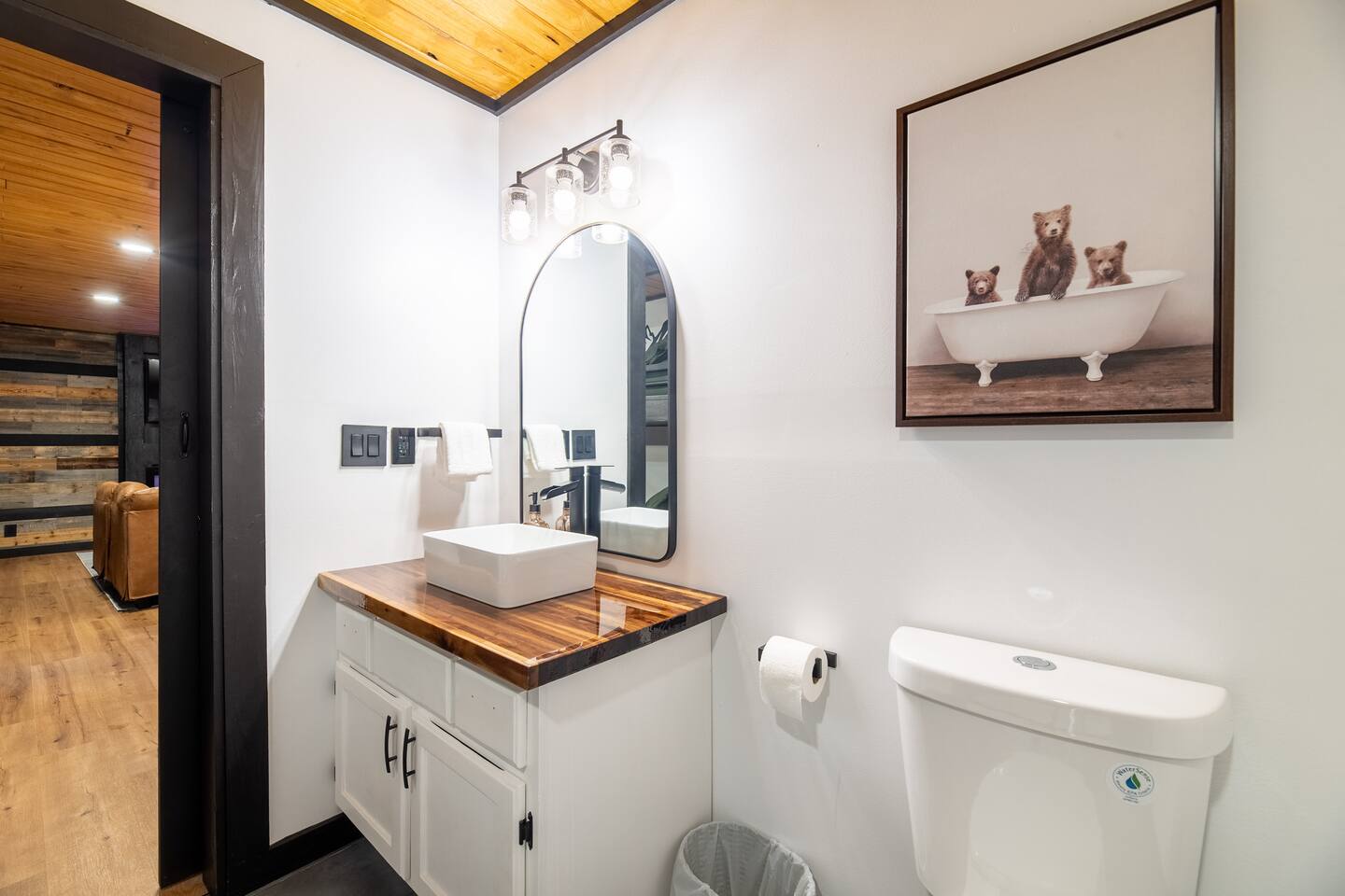 Family time awaits you at Fox Meadow Lodge, a modern take on the classic mountain cabin, offering panoramic views of nature. This spacious two-story retreat features two King en-suite bedrooms, one Queen bedroom, three Twin Bunk Beds, 4 Full bathrooms, a Barn Movie Theatre, Arcade/Game room, Hot Tub, Fire Pit Pergola (for the whole family), Firepit with bench (for couples- overlooking the meadow) and a Mini Golf Course, making it the perfect getaway for families and friends! Nestled in the mountains this cabin provides easy access to all the attractions of the Smoky Mountains while offering a peaceful, scenic retreat. Come for the views and entertainment, leave with memories that will last a lifetime. Parking: There is ample parking at the cabin for up to 5 vehicles. Main Floor: Step inside to a warm and welcoming space featuring one King Suite, a full bathroom with common access, one Queen bedroom. The Kitchen features a waterfall butcher block island with bar seating for two. Prepare meals in the gourmet kitchen with high-end appliances stocked with all the essential cookware as well as salt/pepper/olive oil. At the coffee station you will find complementary k-cups for your enjoyment. The dining room has panoramic windows allowing for a unique dining experience and is perfect for large shared meals, while the private deck offers a peaceful spot to barbeque or soak in the hot tub while enjoying morning coffee or evening wine. Each bathroom has custom tile and is stocked with plenty of towels, conditioner/shampoo/bodywash, hand soap, lotion, and a hairdryer (under the vanity). The Living Room features a stacked stone floor to ceiling electric fireplace with a smart TV and two comfy couches. Lower Level: As you descend down stairs you will find a room specifically geared for kiddos! This area offer a large sectional and 6 Twin Beds with as large round table in the center of room perfect for board games or coloring. There is a full bathroom with a bathtub perfect for the bath time. As you venture past the kids area you will find another King Suite with custom tile walk-in shower. The bathrooms are stocked with plenty of towels, conditioner/shampoo/bodywash, hand soap, lotion, and a hairdryer (under the vanity). Outdoors/Exterior: You will find far more than just views of wildlife and nature while enjoying the outdoors of Fox Meadow Lodge, such as, a Fire Pit Pergola with seating for 12, custom 6 hole Mini Golf Course, oversized sand box and kids play area, Barn Theatre with seating for 12. On the Main LVL Deck you will find a BBQ Grill and a Hot Tub with built in drink ledge. ✨ Book now and start planning your dream mountain getaway! ✨ Amenities that are included: 🔥Electric fireplace in every room 🛁 Hot Tub 🪵 Outdoor fire pit Pergola 📺 Smart TV in every room 🔊 High speed internet 🧴Shampoo, conditioner and body wash in every bathroom 🧼 Dish washer (pods provided) 🍞 Toaster ☕️ Coffee Maker (coffee pods provided to get you started) ♨️ Microwave 🎬 Barn Movie Theatre 🎱Pool Table 🕹️Arcade 🍿 Popcorn Maker 🧺 Washer and dryer (detergent and dryer sheets provided) 👔 Iron + board 💆♀️ Hair dryer 🛏️ Plenty of towels, blankets and pillows ⛳️ Mini Golf course 🏜️ Kids sand pit area
