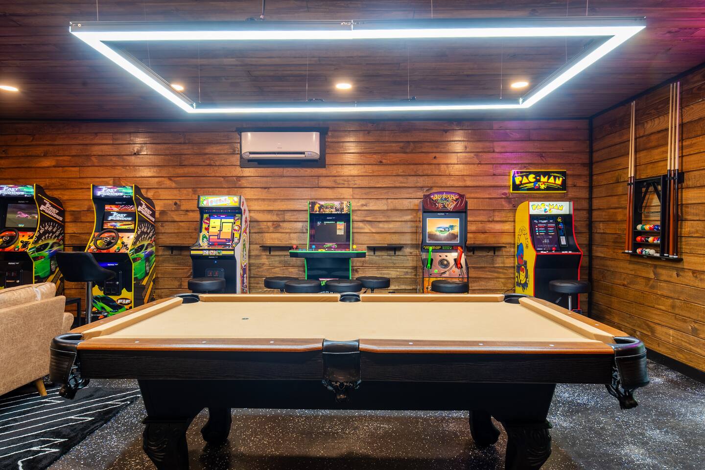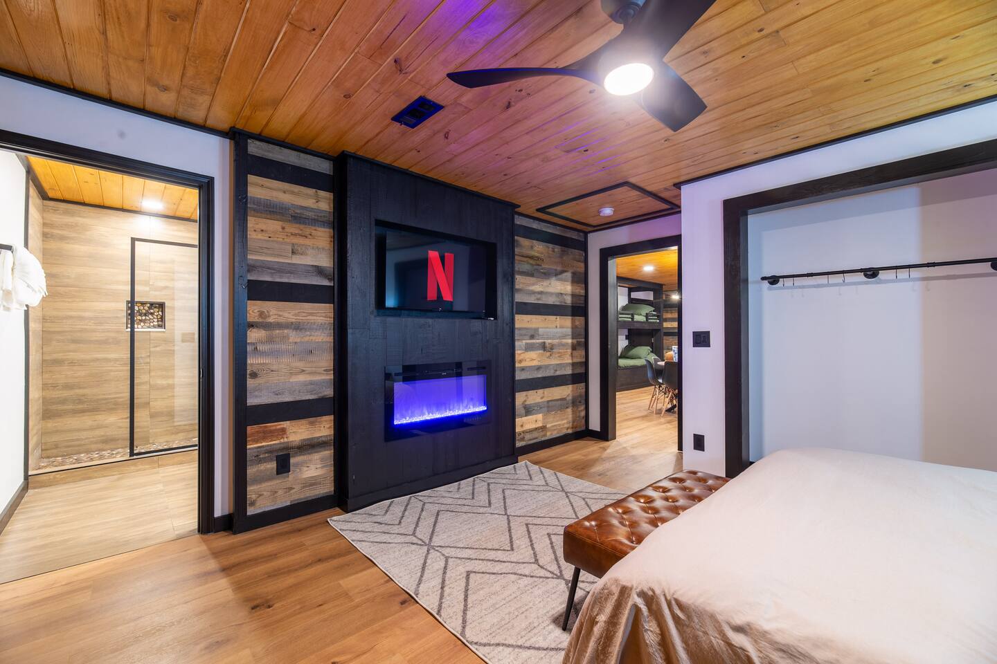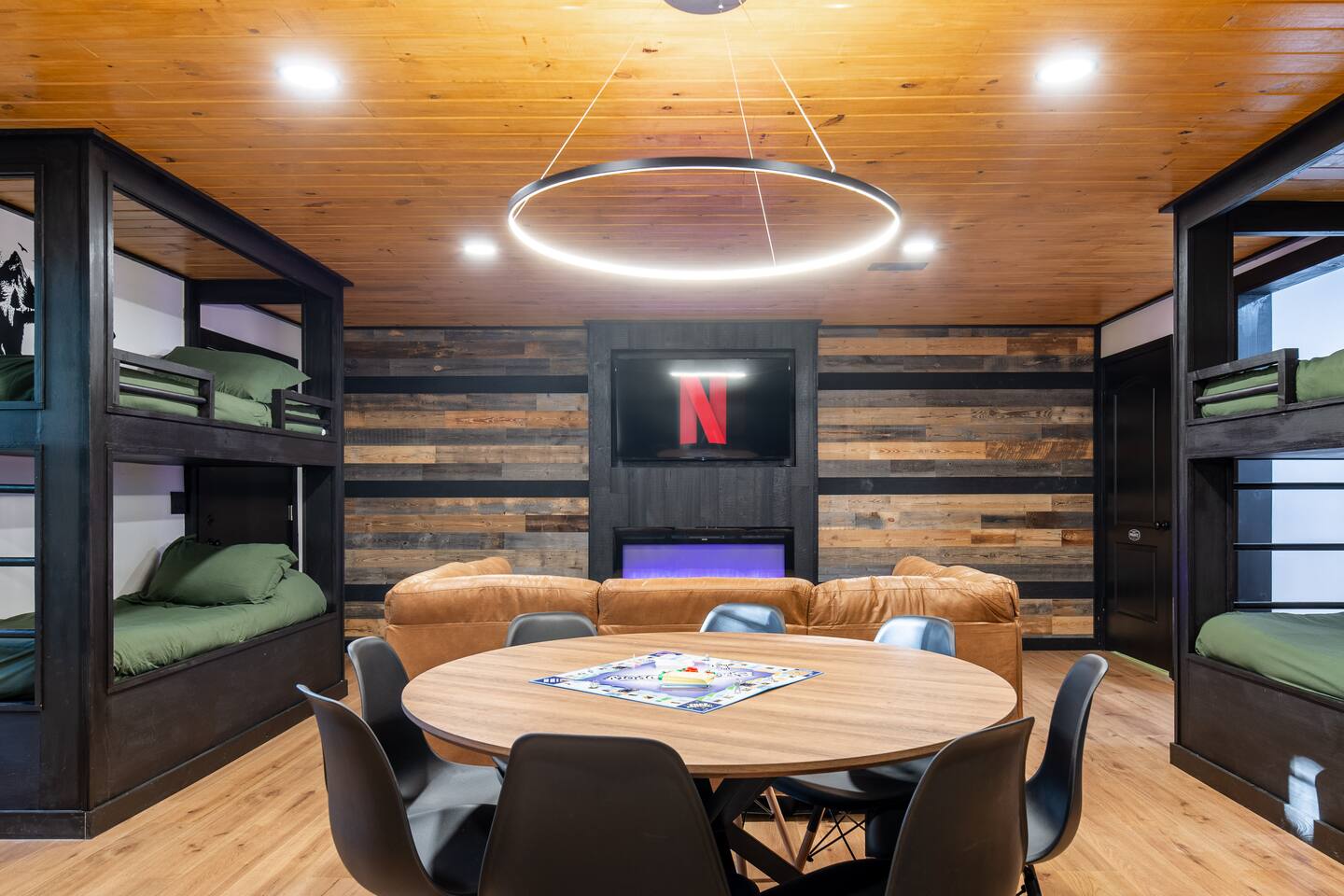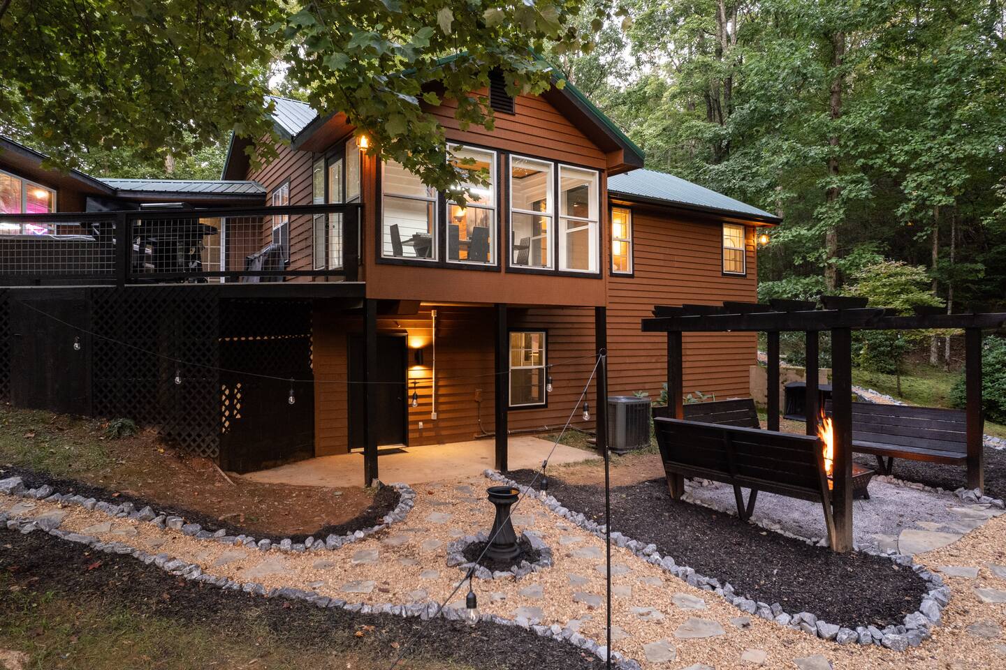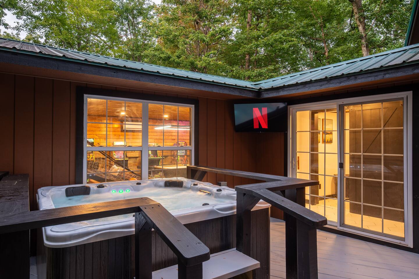 Family time awaits you at Fox Meadow Lodge, a modern take on the classic mountain cabin, offering panoramic views of nature. This spacious two-story retreat features two King en-suite bedrooms, one Queen bedroom, three Twin Bunk Beds, 4 Full bathrooms, a Barn Movie Theatre, Arcade/Game room, Hot Tub, Fire Pit Pergola (for the whole family), Firepit with bench (for couples- overlooking the meadow) and a Mini Golf Course, making it the perfect getaway for families and friends! Nestled in the mountains this cabin provides easy access to all the attractions of the Smoky Mountains while offering a peaceful, scenic retreat. Come for the views and entertainment, leave with memories that will last a lifetime. Parking: There is ample parking at the cabin for up to 5 vehicles. Main Floor: Step inside to a warm and welcoming space featuring one King Suite, a full bathroom with common access, one Queen bedroom. The Kitchen features a waterfall butcher block island with bar seating for two. Prepare meals in the gourmet kitchen with high-end appliances stocked with all the essential cookware as well as salt/pepper/olive oil. At the coffee station you will find complementary k-cups for your enjoyment. The dining room has panoramic windows allowing for a unique dining experience and is perfect for large shared meals, while the private deck offers a peaceful spot to barbeque or soak in the hot tub while enjoying morning coffee or evening wine. Each bathroom has custom tile and is stocked with plenty of towels, conditioner/shampoo/bodywash, hand soap, lotion, and a hairdryer (under the vanity). The Living Room features a stacked stone floor to ceiling electric fireplace with a smart TV and two comfy couches. Lower Level: As you descend down stairs you will find a room specifically geared for kiddos! This area offer a large sectional and 6 Twin Beds with as large round table in the center of room perfect for board games or coloring. There is a full bathroom with a bathtub perfect for the bath time. As you venture past the kids area you will find another King Suite with custom tile walk-in shower. The bathrooms are stocked with plenty of towels, conditioner/shampoo/bodywash, hand soap, lotion, and a hairdryer (under the vanity). Outdoors/Exterior: You will find far more than just views of wildlife and nature while enjoying the outdoors of Fox Meadow Lodge, such as, a Fire Pit Pergola with seating for 12, custom 6 hole Mini Golf Course, oversized sand box and kids play area, Barn Theatre with seating for 12. On the Main LVL Deck you will find a BBQ Grill and a Hot Tub with built in drink ledge. ✨ Book now and start planning your dream mountain getaway! ✨ Amenities that are included: 🔥Electric fireplace in every room 🛁 Hot Tub 🪵 Outdoor fire pit Pergola 📺 Smart TV in every room 🔊 High speed internet 🧴Shampoo, conditioner and body wash in every bathroom 🧼 Dish washer (pods provided) 🍞 Toaster ☕️ Coffee Maker (coffee pods provided to get you started) ♨️ Microwave 🎬 Barn Movie Theatre 🎱Pool Table 🕹️Arcade 🍿 Popcorn Maker 🧺 Washer and dryer (detergent and dryer sheets provided) 👔 Iron + board 💆♀️ Hair dryer 🛏️ Plenty of towels, blankets and pillows ⛳️ Mini Golf course 🏜️ Kids sand pit area