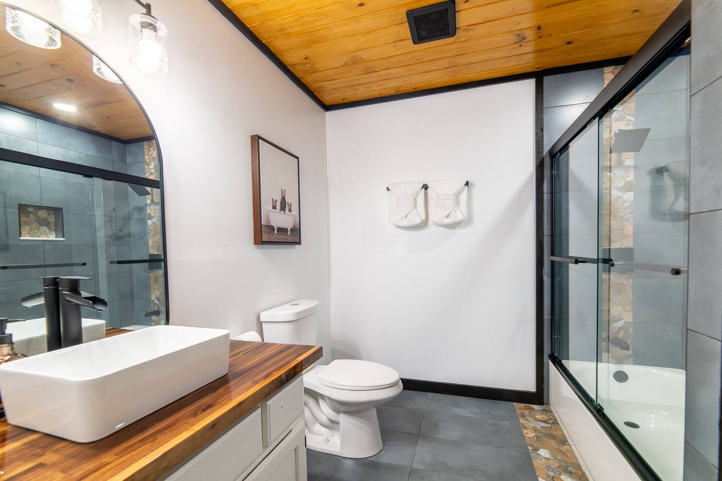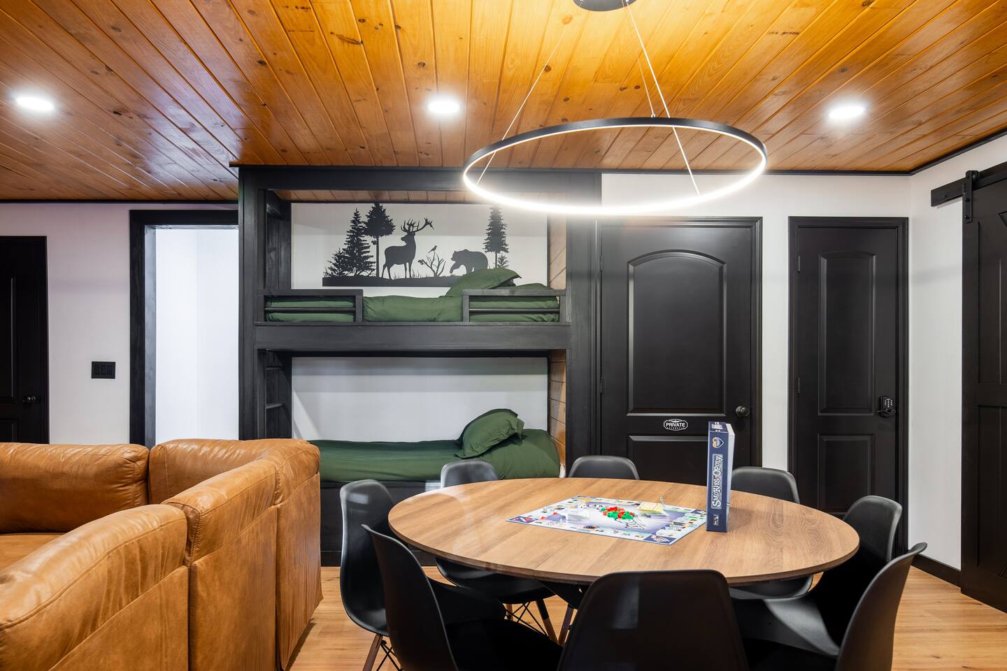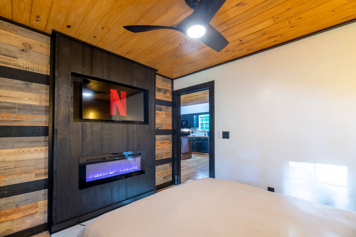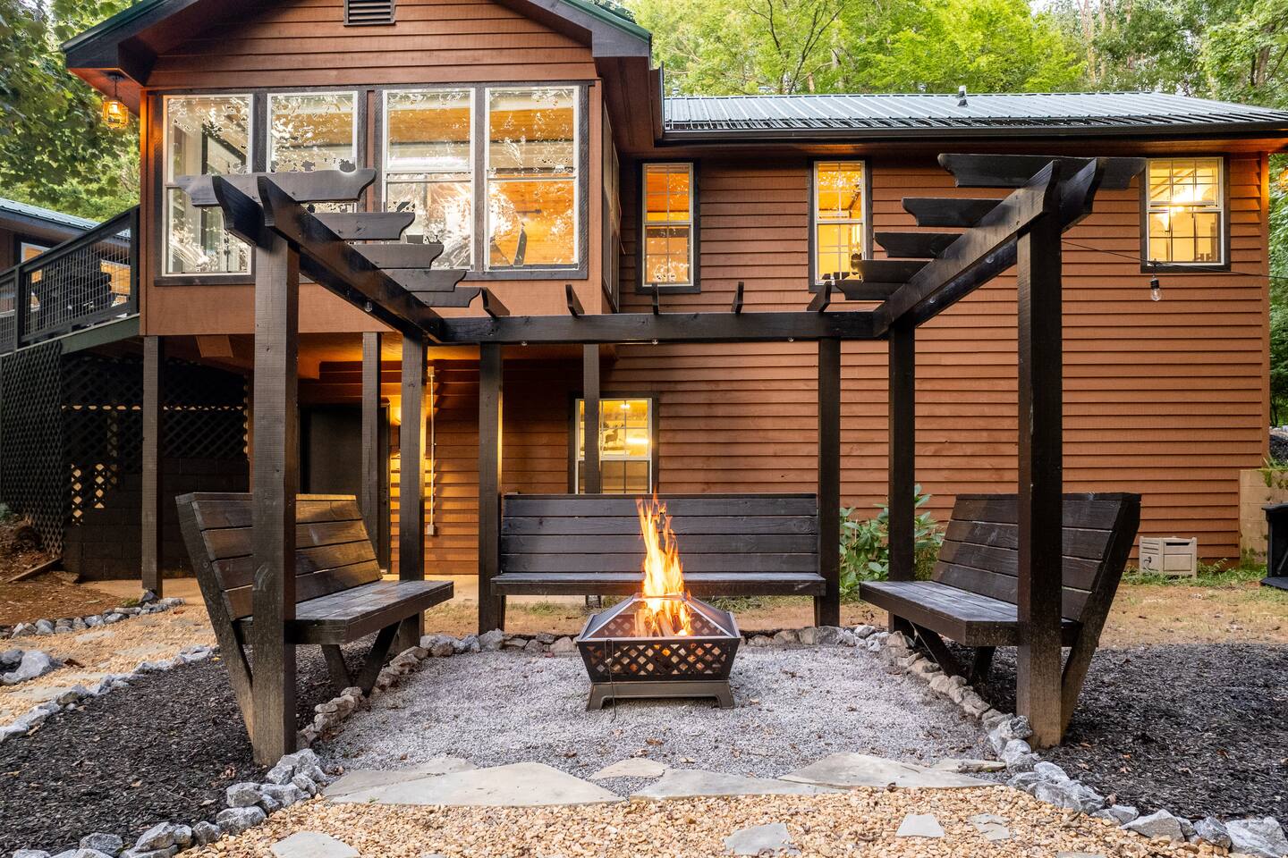 Family time awaits you at Fox Meadow Lodge, a modern take on the classic mountain cabin, offering panoramic views of nature. This spacious two-story retreat features two King en-suite bedrooms, one Queen bedroom, three Twin Bunk Beds, 4 Full bathrooms, a Barn Movie Theatre, Arcade/Game room, Hot Tub, Fire Pit Pergola (for the whole family), Firepit with bench (for couples- overlooking the meadow) and a Mini Golf Course, making it the perfect getaway for families and friends! Nestled in the mountains this cabin provides easy access to all the attractions of the Smoky Mountains while offering a peaceful, scenic retreat. Come for the views and entertainment, leave with memories that will last a lifetime. Parking: There is ample parking at the cabin for up to 5 vehicles. Main Floor: Step inside to a warm and welcoming space featuring one King Suite, a full bathroom with common access, one Queen bedroom. The Kitchen features a waterfall butcher block island with bar seating for two. Prepare meals in the gourmet kitchen with high-end appliances stocked with all the essential cookware as well as salt/pepper/olive oil. At the coffee station you will find complementary k-cups for your enjoyment. The dining room has panoramic windows allowing for a unique dining experience and is perfect for large shared meals, while the private deck offers a peaceful spot to barbeque or soak in the hot tub while enjoying morning coffee or evening wine. Each bathroom has custom tile and is stocked with plenty of towels, conditioner/shampoo/bodywash, hand soap, lotion, and a hairdryer (under the vanity). The Living Room features a stacked stone floor to ceiling electric fireplace with a smart TV and two comfy couches. Lower Level: As you descend down stairs you will find a room specifically geared for kiddos! This area offer a large sectional and 6 Twin Beds with as large round table in the center of room perfect for board games or coloring. There is a full bathroom with a bathtub perfect for the bath time. As you venture past the kids area you will find another King Suite with custom tile walk-in shower. The bathrooms are stocked with plenty of towels, conditioner/shampoo/bodywash, hand soap, lotion, and a hairdryer (under the vanity). Outdoors/Exterior: You will find far more than just views of wildlife and nature while enjoying the outdoors of Fox Meadow Lodge, such as, a Fire Pit Pergola with seating for 12, custom 6 hole Mini Golf Course, oversized sand box and kids play area, Barn Theatre with seating for 12. On the Main LVL Deck you will find a BBQ Grill and a Hot Tub with built in drink ledge. ✨ Book now and start planning your dream mountain getaway! ✨ Amenities that are included: 🔥Electric fireplace in every room 🛁 Hot Tub 🪵 Outdoor fire pit Pergola 📺 Smart TV in every room 🔊 High speed internet 🧴Shampoo, conditioner and body wash in every bathroom 🧼 Dish washer (pods provided) 🍞 Toaster ☕️ Coffee Maker (coffee pods provided to get you started) ♨️ Microwave 🎬 Barn Movie Theatre 🎱Pool Table 🕹️Arcade 🍿 Popcorn Maker 🧺 Washer and dryer (detergent and dryer sheets provided) 👔 Iron + board 💆♀️ Hair dryer 🛏️ Plenty of towels, blankets and pillows ⛳️ Mini Golf course 🏜️ Kids sand pit area