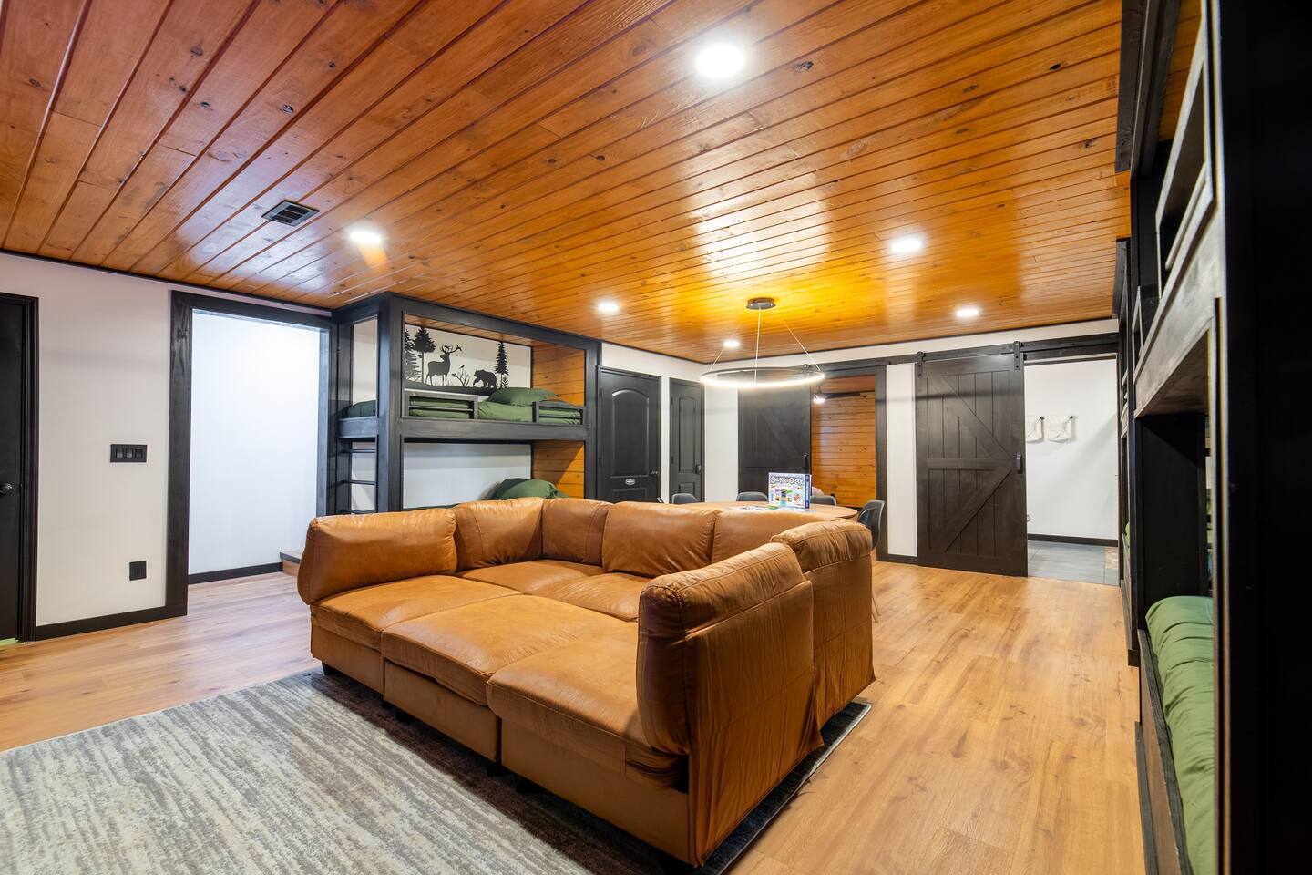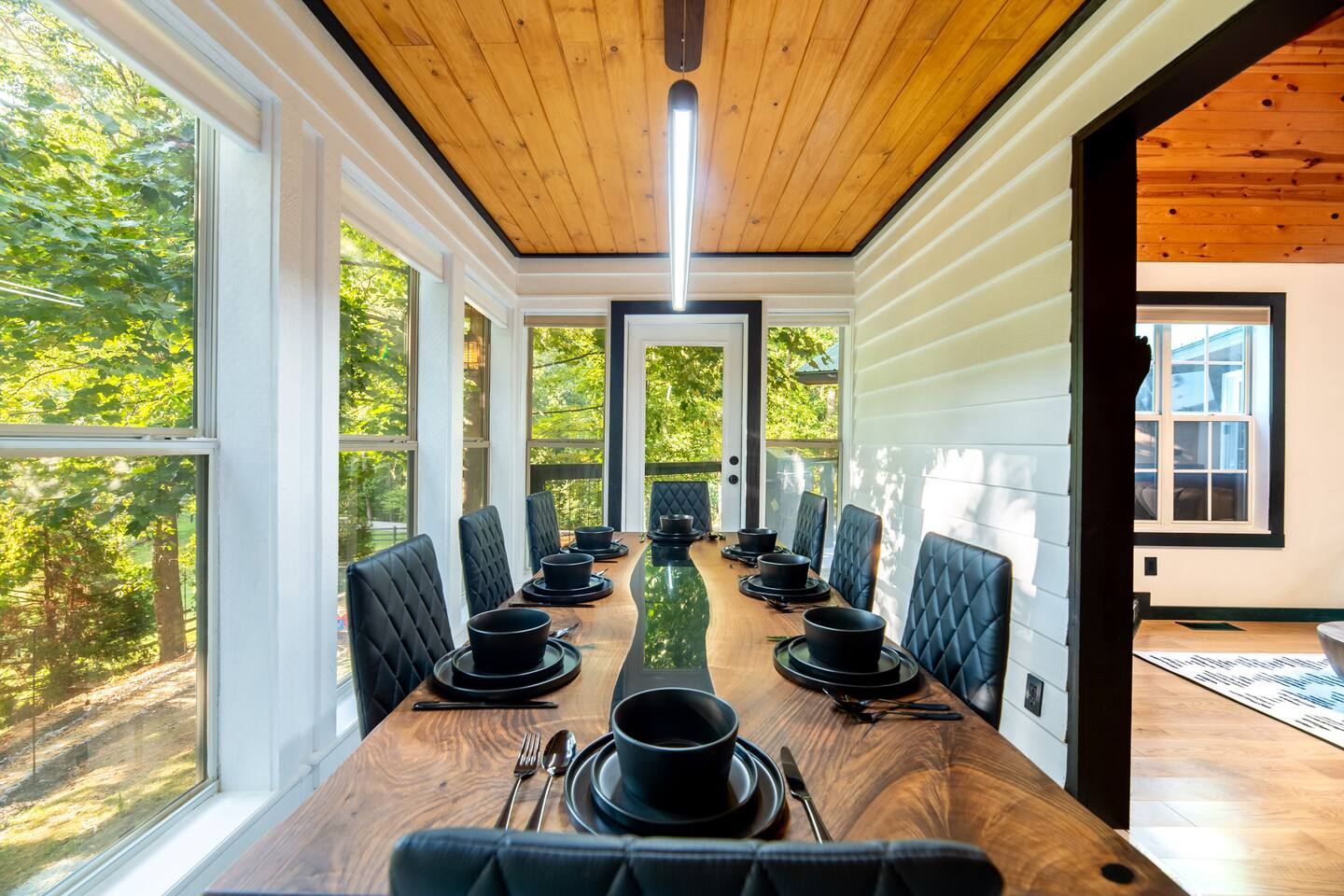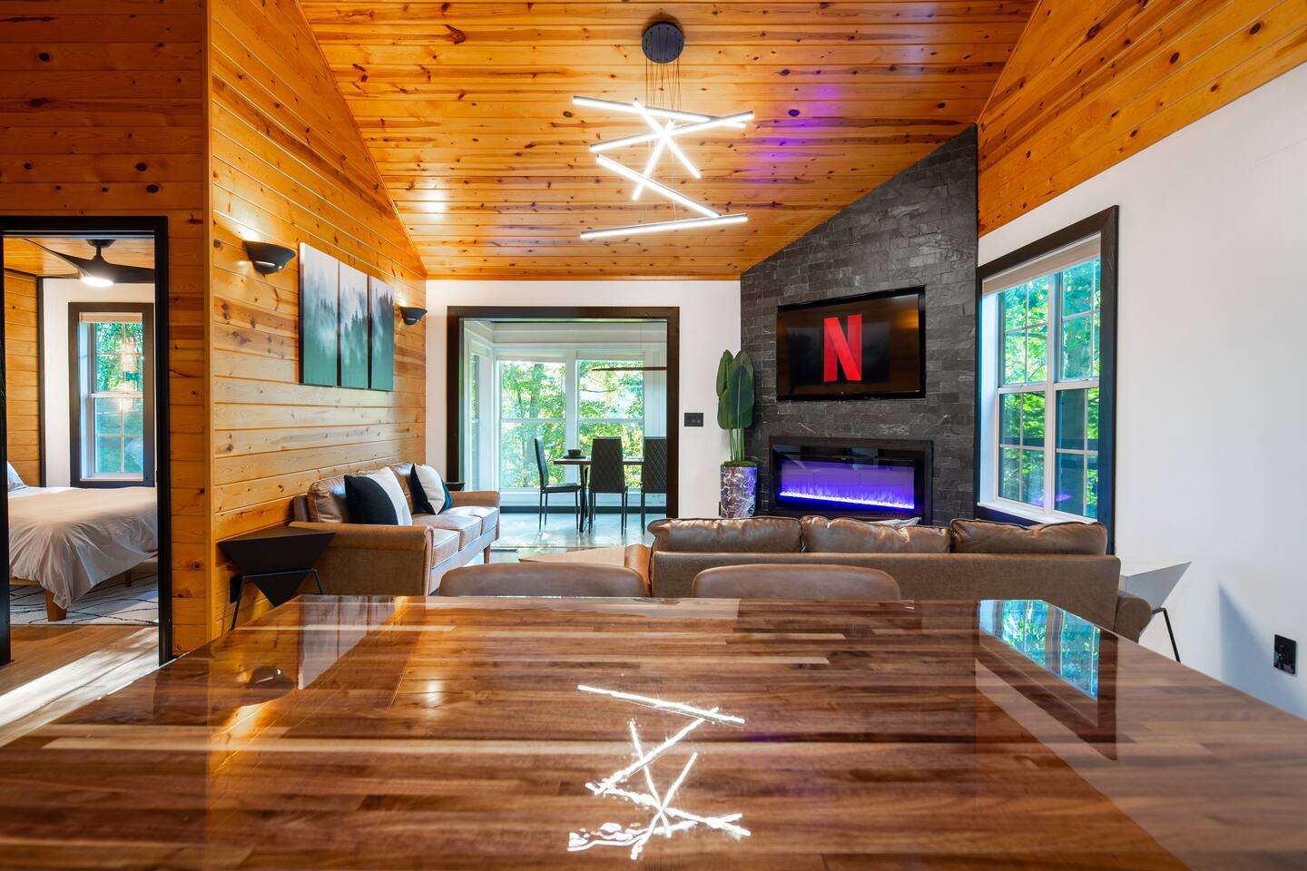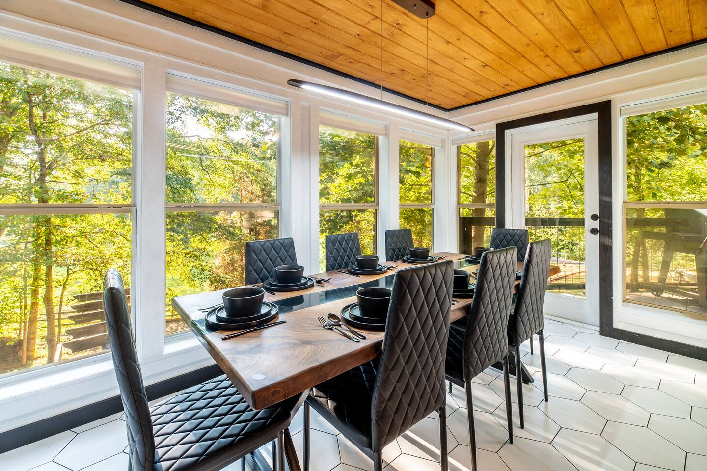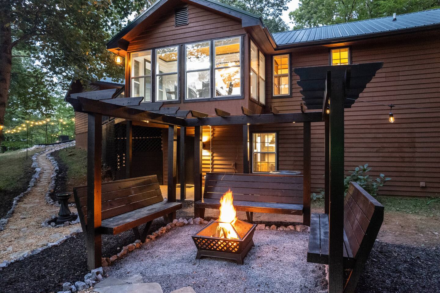 Family time awaits you at Fox Meadow Lodge, a modern take on the classic mountain cabin, offering panoramic views of nature. This spacious two-story retreat features two King en-suite bedrooms, one Queen bedroom, three Twin Bunk Beds, 4 Full bathrooms, a Barn Movie Theatre, Arcade/Game room, Hot Tub, Fire Pit Pergola (for the whole family), Firepit with bench (for couples- overlooking the meadow) and a Mini Golf Course, making it the perfect getaway for families and friends! Nestled in the mountains this cabin provides easy access to all the attractions of the Smoky Mountains while offering a peaceful, scenic retreat. Come for the views and entertainment, leave with memories that will last a lifetime. Parking: There is ample parking at the cabin for up to 5 vehicles. Main Floor: Step inside to a warm and welcoming space featuring one King Suite, a full bathroom with common access, one Queen bedroom. The Kitchen features a waterfall butcher block island with bar seating for two. Prepare meals in the gourmet kitchen with high-end appliances stocked with all the essential cookware as well as salt/pepper/olive oil. At the coffee station you will find complementary k-cups for your enjoyment. The dining room has panoramic windows allowing for a unique dining experience and is perfect for large shared meals, while the private deck offers a peaceful spot to barbeque or soak in the hot tub while enjoying morning coffee or evening wine. Each bathroom has custom tile and is stocked with plenty of towels, conditioner/shampoo/bodywash, hand soap, lotion, and a hairdryer (under the vanity). The Living Room features a stacked stone floor to ceiling electric fireplace with a smart TV and two comfy couches. Lower Level: As you descend down stairs you will find a room specifically geared for kiddos! This area offer a large sectional and 6 Twin Beds with as large round table in the center of room perfect for board games or coloring. There is a full bathroom with a bathtub perfect for the bath time. As you venture past the kids area you will find another King Suite with custom tile walk-in shower. The bathrooms are stocked with plenty of towels, conditioner/shampoo/bodywash, hand soap, lotion, and a hairdryer (under the vanity). Outdoors/Exterior: You will find far more than just views of wildlife and nature while enjoying the outdoors of Fox Meadow Lodge, such as, a Fire Pit Pergola with seating for 12, custom 6 hole Mini Golf Course, oversized sand box and kids play area, Barn Theatre with seating for 12. On the Main LVL Deck you will find a BBQ Grill and a Hot Tub with built in drink ledge. ✨ Book now and start planning your dream mountain getaway! ✨ Amenities that are included: 🔥Electric fireplace in every room 🛁 Hot Tub 🪵 Outdoor fire pit Pergola 📺 Smart TV in every room 🔊 High speed internet 🧴Shampoo, conditioner and body wash in every bathroom 🧼 Dish washer (pods provided) 🍞 Toaster ☕️ Coffee Maker (coffee pods provided to get you started) ♨️ Microwave 🎬 Barn Movie Theatre 🎱Pool Table 🕹️Arcade 🍿 Popcorn Maker 🧺 Washer and dryer (detergent and dryer sheets provided) 👔 Iron + board 💆♀️ Hair dryer 🛏️ Plenty of towels, blankets and pillows ⛳️ Mini Golf course 🏜️ Kids sand pit area