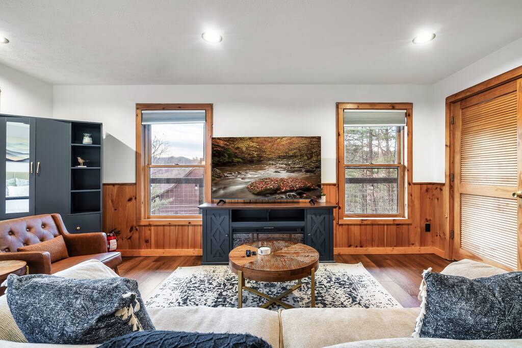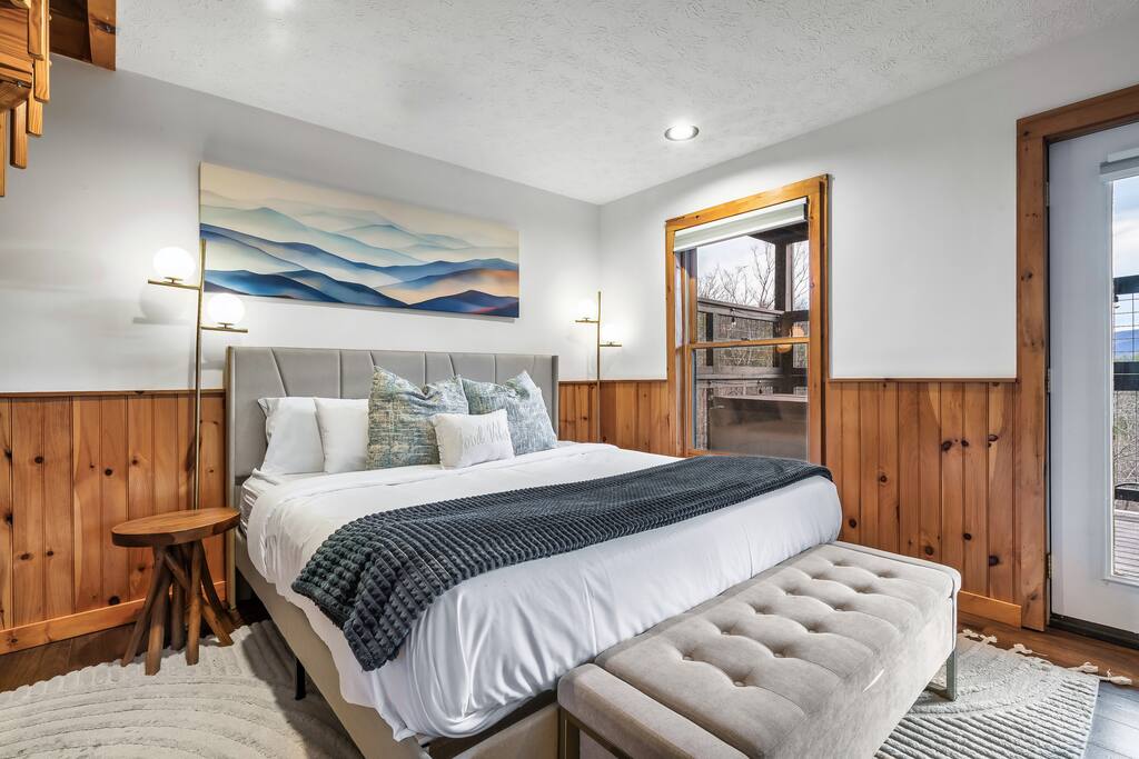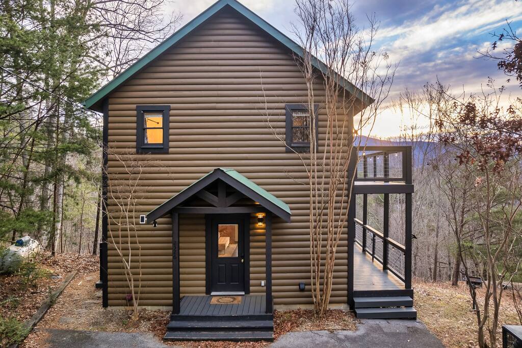 ❣️Mountaintop Escape❣️is a NEW ✨ one-of-a-kind ✨ romantic one-bed, two-bath cabin tucked into the woods. Within the cabin's living areas, you will find a lavish king-size bed, a well-equipped kitchen, an intimate dining area beside a large bay window offering stunning views of The Smokies ⛰️, a roomy couch with snuggle-worthy throws, and a luxurious bathroom complete with a tile walk-in shower. The ✨Bedroom✨ features dual nightstands ready to power up your gadgets, luggage racks to save your back, closet with washer/dryer & a large dresser for those longer stays accompanied by a large 55" smart TV playing Netflix to keep you entertained sitting on top of an electric fireplace. 🎬🍿! Enjoy private access to the deck! The ✨Bathroom✨ features a beautiful custom tile walk-in shower🚿! It provides shampoo, conditioner, body wash, and and two plush waffle bathrobes for extra bliss.. There is also a second full bathroom upstairs off the kitchen for your convenance. The ✨Kitchen ✨ is stocked with high-quality cookware🧑🏻🍳. A spice rack, Keurig Duo, Oil, Salt & Pepper, Keurig Duo with a few pods to kickstart your day ☕️. There's also a trusty dishwasher on standby to handle the mess for after! The ✨Living Room ✨ is equipped with a stacked stone gas fireplace and a wall of windows framing in the epic mountain view. The wrap-around ✨patio ✨is a whole vibe! Dive into the hot tub with a glass of wine🍷, cozy up by the fire 🔥 on the patio chairs, or sizzle some BBQ 🍔 or simply enjoy the stunning mountain views of the Smokies🌅! ‼️ATTENTION‼️ Here is important information to enhance your stay. Prepare for a luxurious woodland adventure where you might encounter adorable critters 🐻🍃, and remember that you are surrounded by woods, so encountering harmless bugs 🪲 is inevitable. Using the hot tub is entirely at your own risk ⚠️. Smoking of any kind is strictly prohibited on the property 🚭. If our cleaners detect any signs of smoking, a $500 fee will be charged. Please adhere to our check-in and check-out timings ⏰. Unauthorized early check-ins or late check-outs are prohibited and will incur additional charges. If the guest fails to vacate the property on time, a fee of $50.00 will be charged for the first half-hour and $100.00 for each subsequent half-hour. Due to Mother Nature's unpredictability 🌪️, we do not provide refunds for weather-related issues, natural disasters, power outages, or events beyond our control. Although we love our furry friends 🐶🐱, we have a strict no-pets policy on the premises. If our cleaners discover any violation of this rule, you will be charged an additional cleaning fee of $500. An outdoor security camera 🎥 monitoring the driveway operates 24/7, recording movement and sound solely for safety reasons. Be reassured that there are NO indoor cameras or cameras pointing towards the front or back of the house, preserving your privacy.