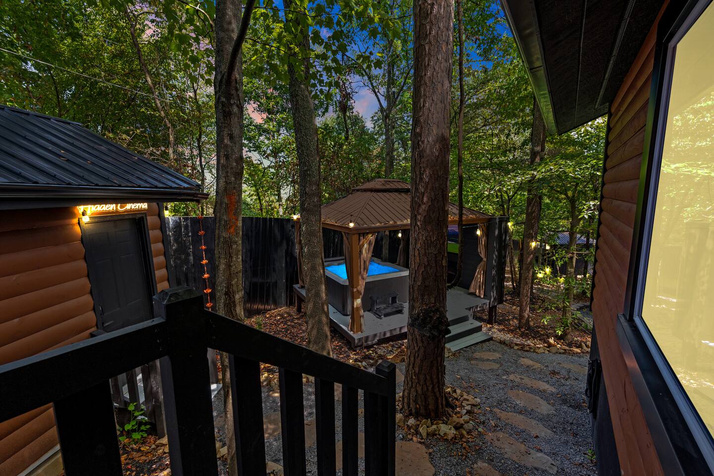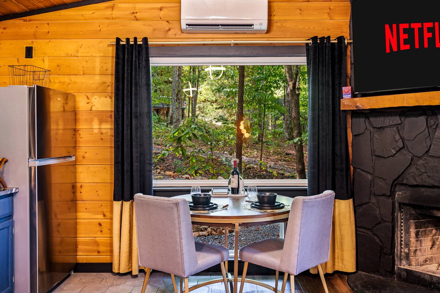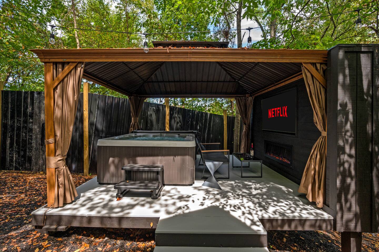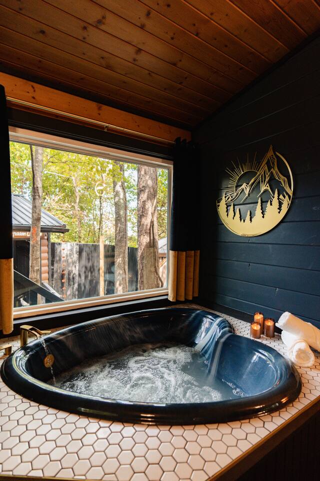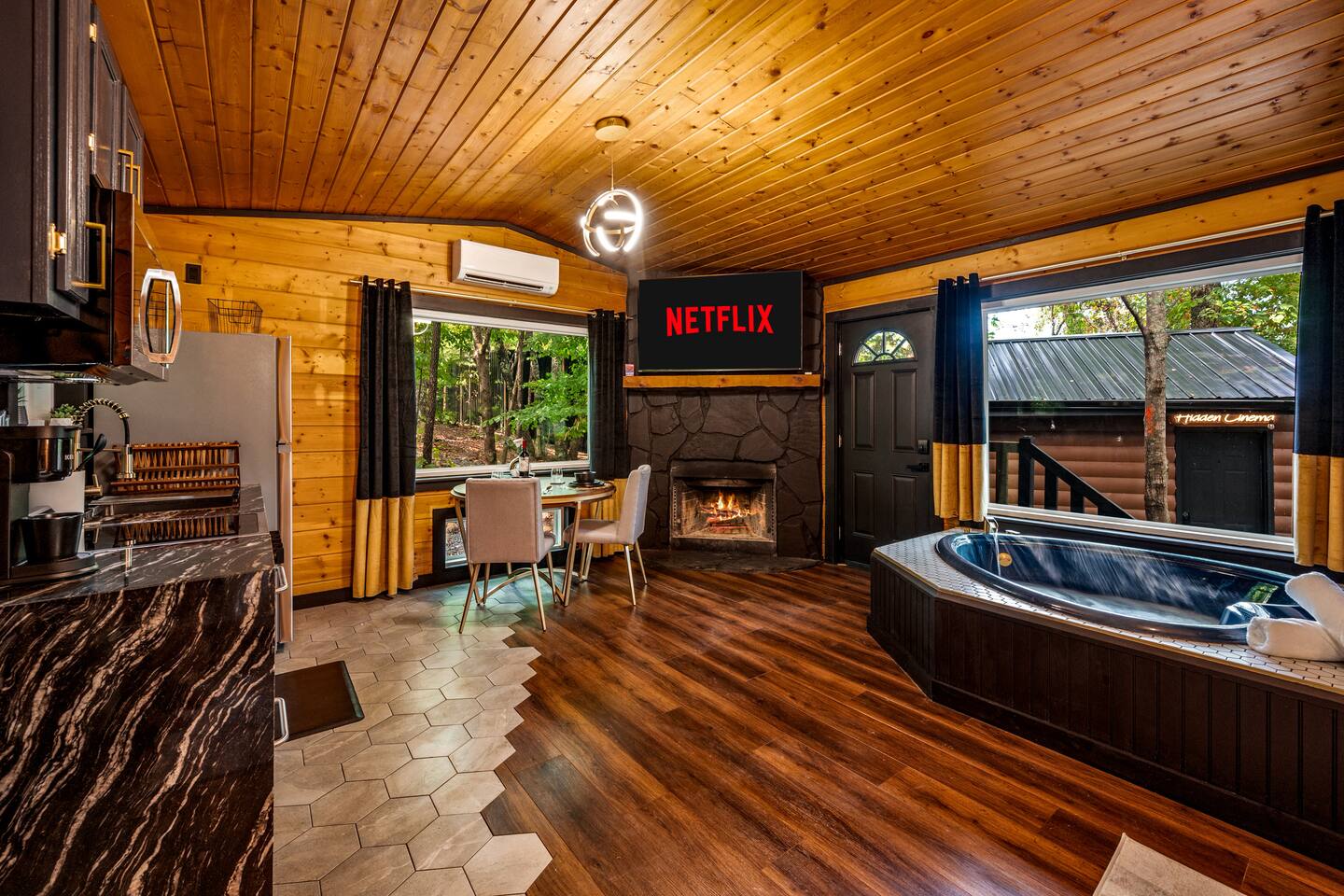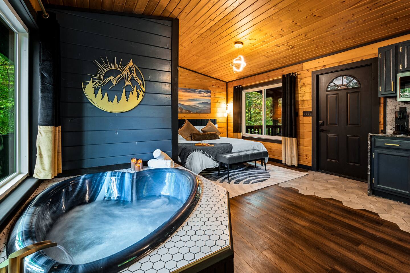 Welcome to Honey Mountain Resort, the perfect getaway for couples! Our five newly renovated luxury honeymoon cabins are thoughtfully designed to create an intimate and romantic atmosphere, ensuring you and your special someone can truly connect. Each cabin features its own private movie theater, hot tub pergola, fire pit, and convenient parking, allowing you to enjoy cozy evenings together under the stars. If your dream cabin is already booked, don’t worry—just click on my profile picture to explore our other enchanting options. We can’t wait to help you create unforgettable memories here at Honey Mountain Resort. Feel free to reach out with any questions; we’re here to assist you! The Hidden Honey is a fully furnished 1 bed, 1 bath studio log cabin with a spacious yard that provides plenty of activities, such as: private theater room, personal hot tub pergola with entertainment center and fire pit. (All these amenities are for your exclusive use, NOT a shared space.) MAIN LIVING AREA: consists of a kitchen, dining table, 65” smart TV, wood burning fireplace, king bed, and a heart shaped jetted tub. KITCHEN: equipped with the essentials to cook a yummy meal, including a Keurig individual cup coffee maker with complimentary coffee pods. BATHROOM: fitted out with a large walk-in tile shower with dual shower head and complimentary shampoo, conditioner and body wash. You will also find cozy waffle bath robes for your comfort. FRONT DECK: you will find a gas fire table with comfy seating and a bbq. PRIVATE THEATER ROOM: can be found just steps from the back deck. The theater room consists of an 85” smart tv with a sound system, 2 leather recliners, barstool eating table, electric fireplace, and popcorn machine. FIRE PIT: as you exit the back of the cabin, you will find a lighted pathway that leads to a 2 seater bench swing with a fire pit, perfect for roasting some s’mores or just enjoying the nature! PERSONAL HOT TUB PERGOLA: as you continue down the lighted pathway, you will find a large pergola fitted out with a 65” tv, electric fireplace and private hot tub. Amenities Included: 🔥 Indoor Wood Burning Fireplace 🪵 Outdoor Wood Burning Fire Pit 🛁 Exclusive Outdoor Hot Tub 🫶🏼 Indoor Love Tub 🍔 BBQ 🔥Outdoor Propane Fire Table 📺 Smart TV 🎬 Free access to Netflix 🔊 WiFi 📽️ Private Theater Room 🚿Walk-in tile shower 🧴Shampoo, conditioner and body wash 👘 Bath Robes ☕️ Coffee Maker ♨️Microwave 💆♀️ Hair dryer 🛏 Plenty of towels, blankets and pillows