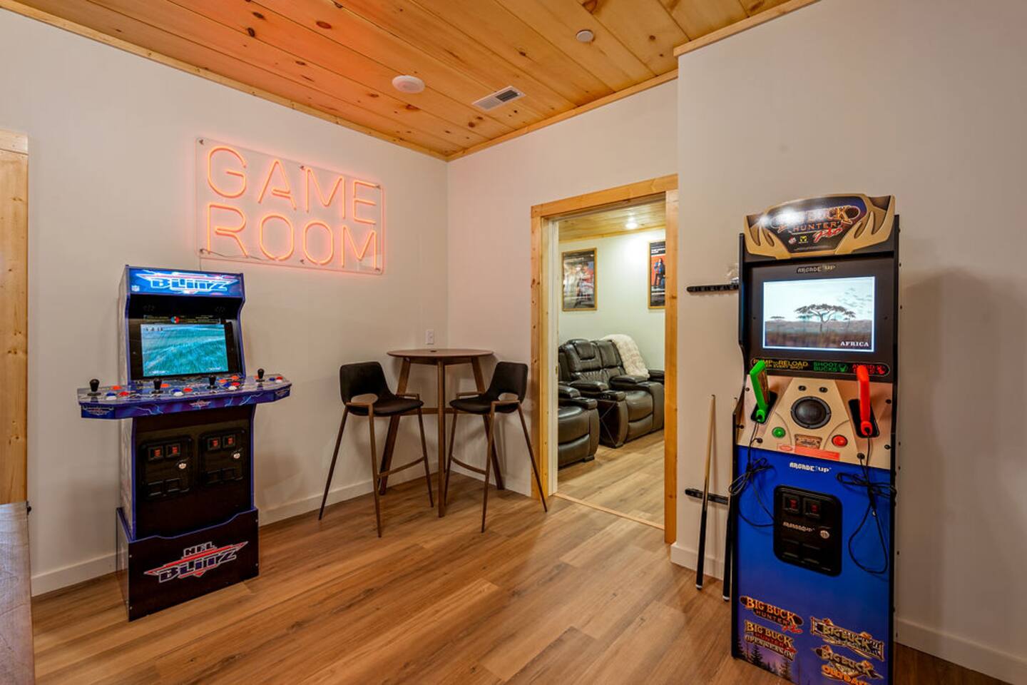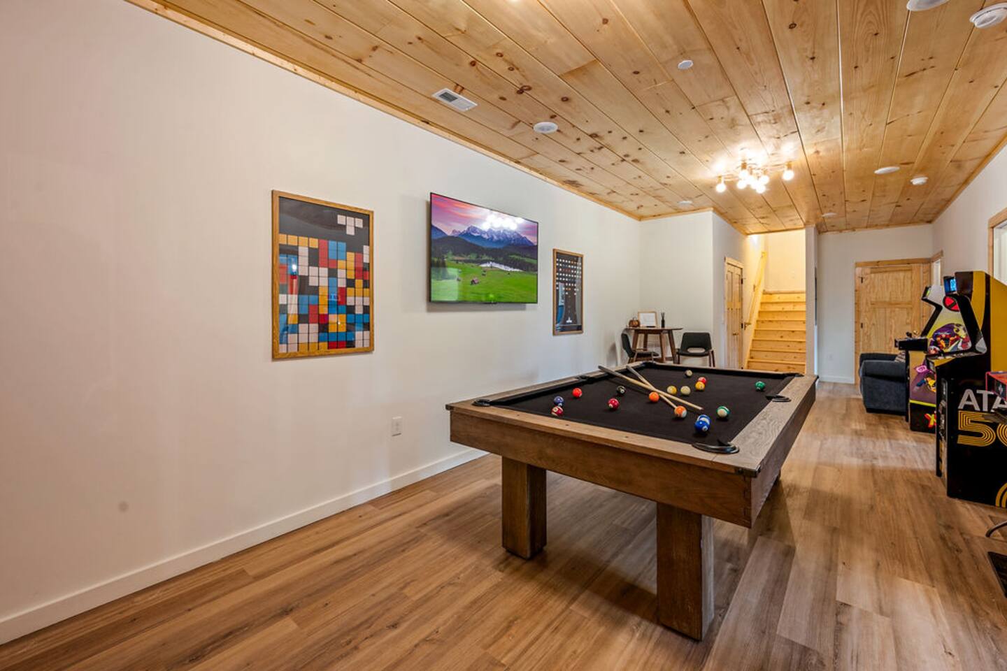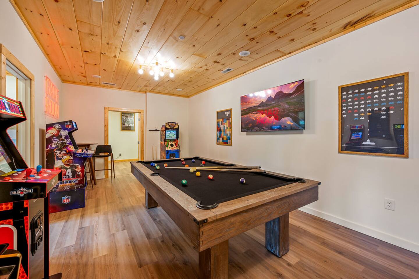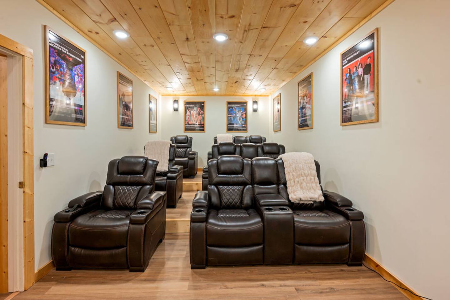 🐻 Chestnut Lodge 🐻 is an ✨exceptional luxury mountain retreat✨ located in the highly sought-after Chalet Village. Perched gracefully along the mountainside and just minutes from downtown Gatlinburg and Pigeon Forge, this exquisite lodge offers the perfect balance of elevated privacy, breathtaking scenery, and effortless access to the area’s top attractions. Designed with intention and sophistication, Chestnut Lodge is ideal for refined group getaways, multi-generational family trips, and unforgettable celebrations with friends. ✨ Sleeping & Private Suites ✨ Thoughtfully designed to sleep up to 16 guests in true comfort, the home features four expansive king en-suite bedrooms, each serving as a private sanctuary. Every en-suite bathroom is finished with custom tile work, walk-in showers, and luxury fixtures—creating a spa-like experience in every suite. The dedicated children’s bunk room offers a queen-over-queen bunk bed and a beautifully appointed en-suite bathroom with a custom tiled tub and shower, making it both elegant and family-friendly. Additional sleeping accommodations include two twin sleeper sofas, discreetly placed in the bunk room and game room to provide flexible options for larger groups. ✨ Upper-Level Owner’s Retreat ✨ The top level showcases two premier king master suites, each with private access to a covered deck offering the most commanding panoramic views of the Smoky Mountains. These suites feature custom tile en-suite bathrooms and serene finishes designed for rest and relaxation. A lofted sitting area overlooks the grand living room below—an intimate space perfect for quiet mornings with coffee, reading, or reconnecting over late-night conversations. ✨ Grand Main Living Area ✨ The main living space is nothing short of breathtaking. Towering ceilings, abundant natural light, and an impressive floor-to-ceiling stacked stone fireplace anchor the room, while two statement chandeliers add warmth and architectural elegance. With ample seating for the entire group, this space is designed for gathering, celebrating, and slowing down together. ✨ Gourmet Kitchen & Dining ✨ Crafted for elevated entertaining, the oversized gourmet kitchen features generous prep space, premium finishes, and is fully stocked with everything needed for memorable home-cooked meals. A large dining table and a striking 10-foot island with breakfast bar seating create the perfect setting for shared meals, celebrations, and long evenings of laughter. Also on the main level is a luxurious king master suite with private deck access and a custom tile spa-style bathroom. ✨ Main-Level Outdoor Living ✨ Step onto the expansive main deck to enjoy outdoor dining for up to 16 guests, a BBQ grill, and a propane fire feature surrounded by plush seating. Overlooking sweeping Smoky Mountain views, this space is ideal for sunrise coffee, sunset dinners, and elegant evenings under the stars. ✨ Lower-Level Entertainment & Leisure ✨ The lower level is a destination of its own. The game room features a pool table, three classic arcade machines, and bar-height tables—perfect for friendly competition and late-night fun. A full laundry room with washer, dryer, and essentials ensures convenience throughout your stay. ✨ Private Suites & Theatre ✨ This level also offers two additional king en-suite bedrooms, each with custom tile bathrooms and private access to the lower deck, along with an additional children’s bunk room and bathroom. Just beyond the game room, a private movie theatre invites cozy family movie nights and immersive entertainment. ✨ Lower-Level Outdoor Oasis ✨ The lower deck features a 20-foot heated swim spa, ideal for relaxation or play, along with comfortable seating and cornhole boards—set against the tranquil backdrop of the Smoky Mountains. 🚗 Easy Access & Parking 🚗 The property offers parking for up to 5 vehicles with a smooth, non-steep driveway, making arrival and departure effortless year-round. With bespoke finishes, custom tile spa bathrooms in every bedroom, dramatic mountain views, and resort-style amenities throughout, Chestnut Lodge delivers a truly elevated Smoky Mountain experience. ✨ Reserve your stay and experience mountain luxury at its finest. ✨ Amenities that are included: 🔥Gas interior stone fireplace 🔥Gas exterior fire feature 🍔BBQ Grill (propane provided) 🛁🏊♂️ Hot Tub/Swim Spa 📺 Smart TV in every room 🔊 High speed internet 🧴Shampoo, conditioner and body wash in every bathroom 🧼 Dish washer (pods provided) 🍞 Toaster ☕️ Coffee Maker (coffee pods provided to get you started) ♨️ Microwave 🎬Movie Theatre 🎱Pool Table 🕹️Arcade 🎥🍿 Popcorn Maker 🧺 Washer and dryer (detergent and dryer sheets provided) 👔 Iron + board 💆♀️ Hair dryer (in every bathroom) 🚿Walk-in tile shower (5x) 🛁 Bathtub 🛏️ Plenty of towels, blankets and pillows 🧻 Plenty of toilet paper and paper towels 🫒 Olive Oil Corn Hole ‼️ATTENTION‼️ Here is important information to enhance your stay. Prepare for a luxurious woodland adventure where you might encounter adorable critters 🐻🍃, and remember that you are surrounded by woods, so encountering harmless bugs 🪲 is inevitable. Using the hot tub is entirely at your own risk ⚠️. Smoking of any kind is strictly prohibited inside the property 🚭. If our cleaners detect any signs of smoking inside, a $500 fee will be charged. Please keep all smoking on the exterior away from entry ways. Please adhere to our check-in and check-out timings ⏰. Unauthorized early check-ins or late check-outs are prohibited and will incur additional charges. If the guest fails to vacate the property on time, a fee of $50.00 will be charged for the first half-hour and $100.00 for each subsequent half-hour. Due to Mother Nature's unpredictability 🌪️, we do not provide refunds for weather-related issues, natural disasters, power