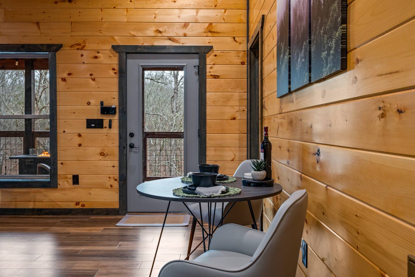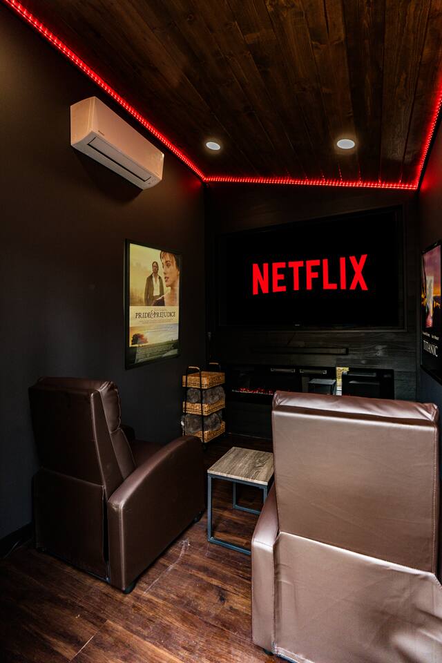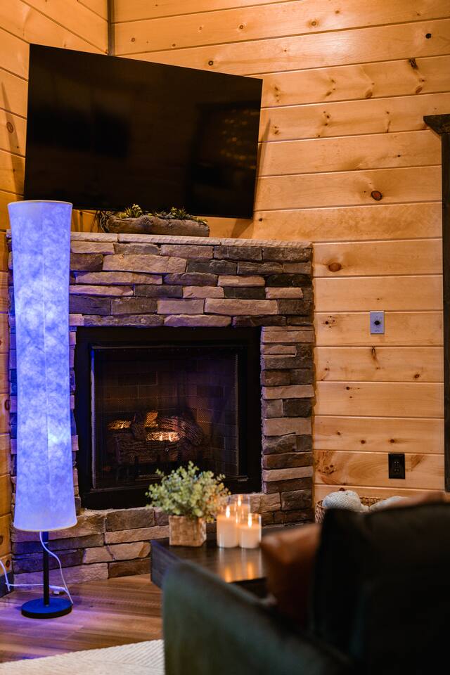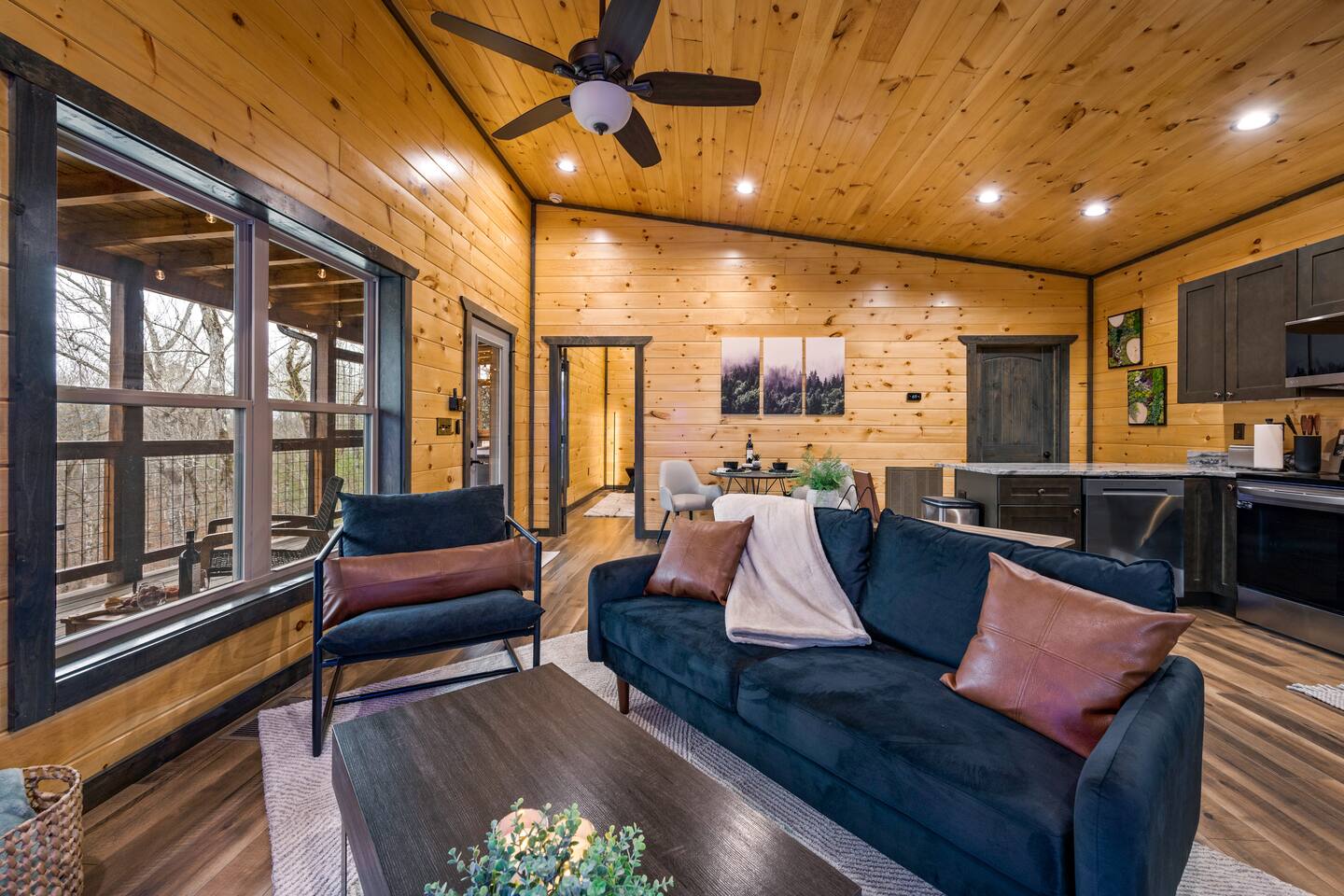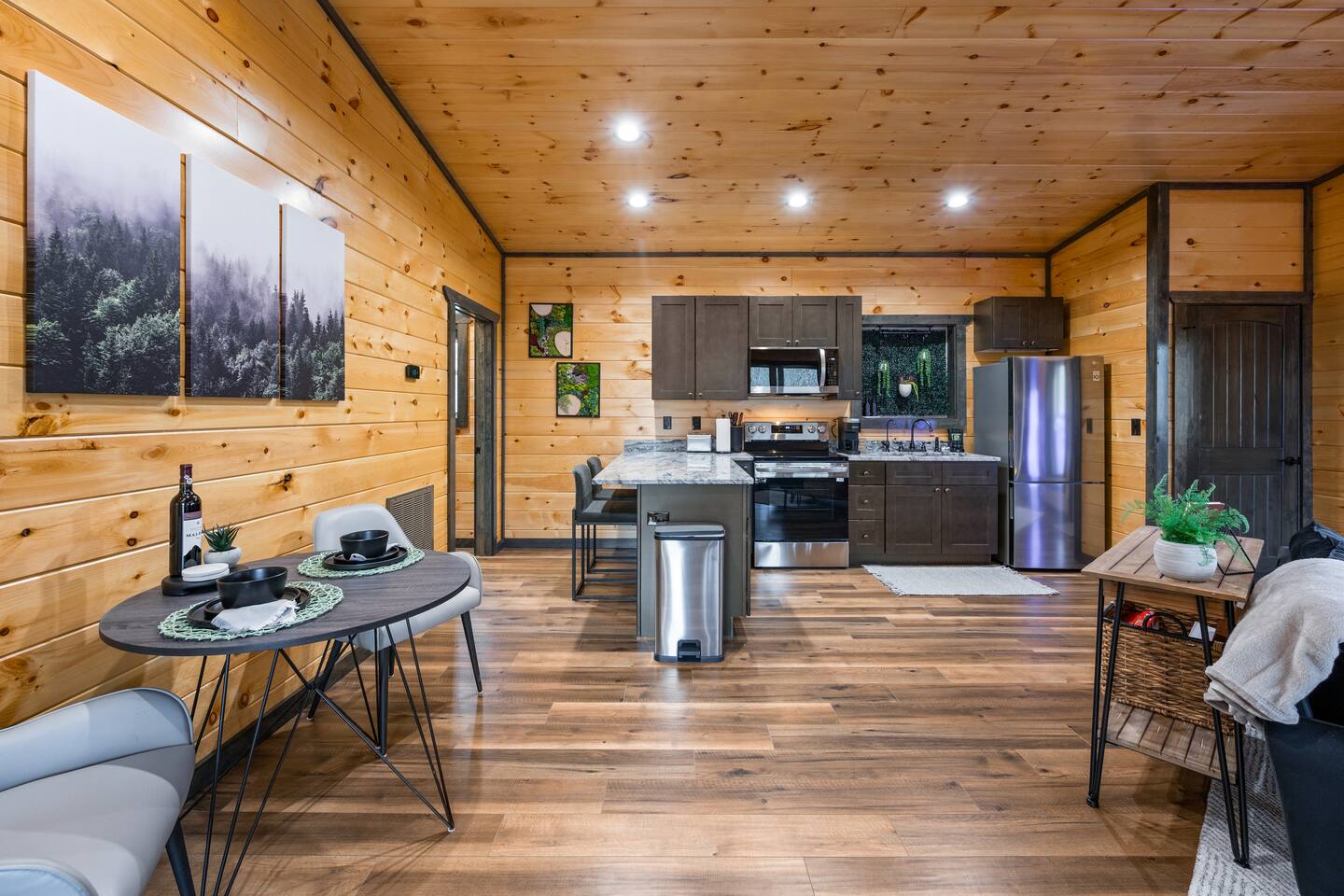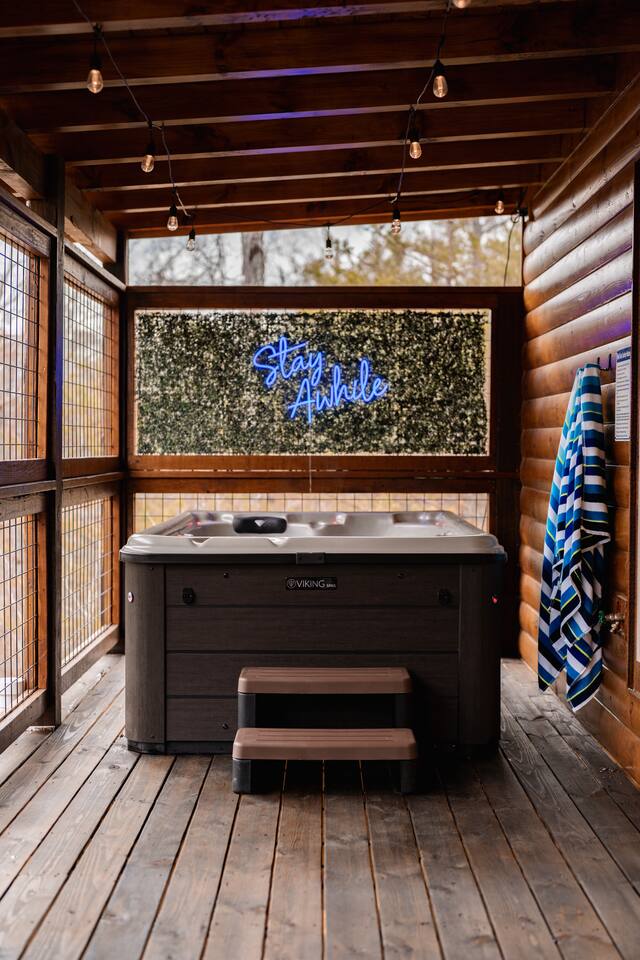 Welcome to Woodland Escape, your enchanting retreat in the heart of the Great Smoky Mountains! This romantic one bedroom honeymoon cabin offers an intimate getaway with a touch of magic. Step inside and discover the rustic charm and modern luxury that define this cabin. The cabin's interior captivates with tasteful decor and large windows that frame the natural beauty outside. The well-equipped kitchen invites you to create romantic meals, while the deck beckons with the promise of unforgettable moments. As night falls, soak in the outdoor hot tub and let the ambiance of the fire feature create a magical setting. Imagine cozy evenings by the fire, surrounded by the sounds of nature and the fresh mountain air. The deck becomes your private sanctuary, offering a perfect blend of warmth and tranquility. The highlight of your stay is the custom couples movie theater, providing an intimate setting for you to enjoy your favorite films together. Snuggle up in the cozy seating and immerse yourselves in a cinematic experience like no other. Whether you're celebrating your honeymoon or simply seeking a romantic getaway, Woodland Escape promises a perfect blend of seclusion and luxury. Book your stay and create lasting memories in this charming cabin! Amenities Included: 🔥 Propane Burning Fireplace in Living Room 🪵 Propane Burning Fire Table on the Deck 🪑Hanging Porch Swing 🛁 Outdoor Hot Tub 🍔 BBQ 📺 Smart TV 🎬 Free access to Netflix 🍿Private movie theatre 🔊 WiFi 🚿Shower 🧴Shampoo, conditioner and body wash 👘 Bath Robes ☕️ Coffee Maker ♨️ Microwave 💆♀️ Hair dryer 🧺 Washer + dryer 🛏 Plenty of towels, blankets and pillows 🎲 Board Games + Puzzle