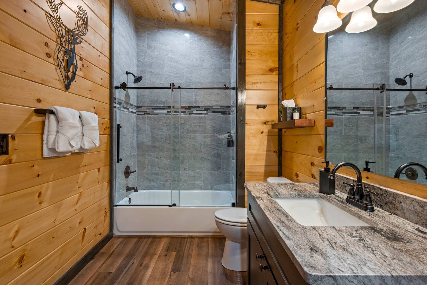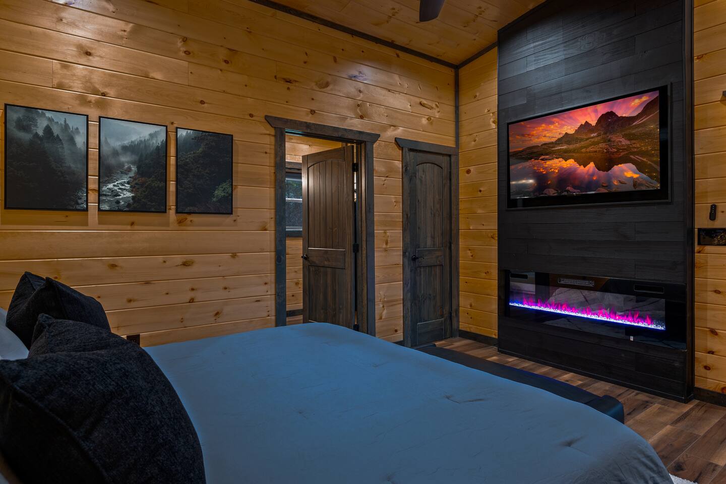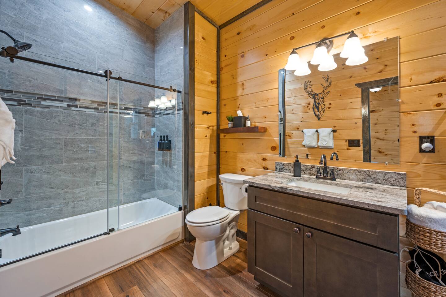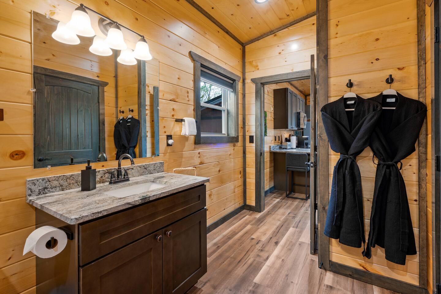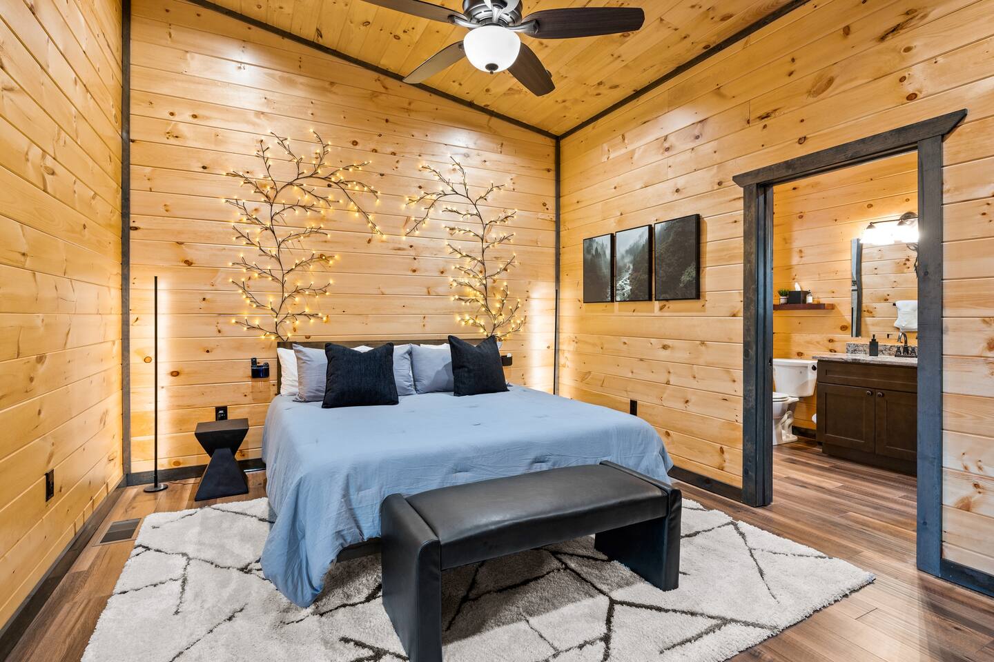 Welcome to Woodland Escape, your enchanting retreat in the heart of the Great Smoky Mountains! This romantic one bedroom honeymoon cabin offers an intimate getaway with a touch of magic. Step inside and discover the rustic charm and modern luxury that define this cabin. The cabin's interior captivates with tasteful decor and large windows that frame the natural beauty outside. The well-equipped kitchen invites you to create romantic meals, while the deck beckons with the promise of unforgettable moments. As night falls, soak in the outdoor hot tub and let the ambiance of the fire feature create a magical setting. Imagine cozy evenings by the fire, surrounded by the sounds of nature and the fresh mountain air. The deck becomes your private sanctuary, offering a perfect blend of warmth and tranquility. The highlight of your stay is the custom couples movie theater, providing an intimate setting for you to enjoy your favorite films together. Snuggle up in the cozy seating and immerse yourselves in a cinematic experience like no other. Whether you're celebrating your honeymoon or simply seeking a romantic getaway, Woodland Escape promises a perfect blend of seclusion and luxury. Book your stay and create lasting memories in this charming cabin! Amenities Included: 🔥 Propane Burning Fireplace in Living Room 🪵 Propane Burning Fire Table on the Deck 🪑Hanging Porch Swing 🛁 Outdoor Hot Tub 🍔 BBQ 📺 Smart TV 🎬 Free access to Netflix 🍿Private movie theatre 🔊 WiFi 🚿Shower 🧴Shampoo, conditioner and body wash 👘 Bath Robes ☕️ Coffee Maker ♨️ Microwave 💆♀️ Hair dryer 🧺 Washer + dryer 🛏 Plenty of towels, blankets and pillows 🎲 Board Games + Puzzle