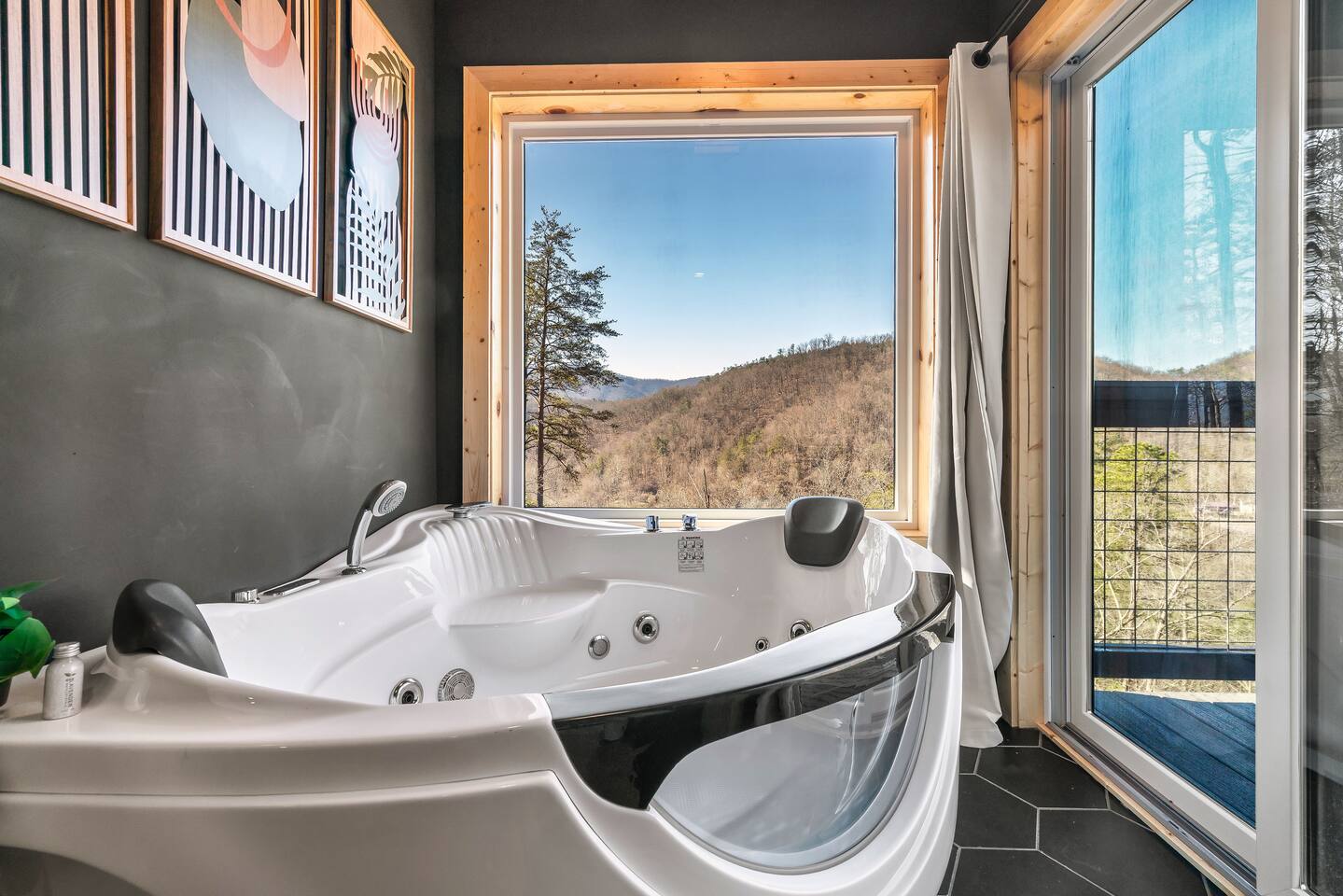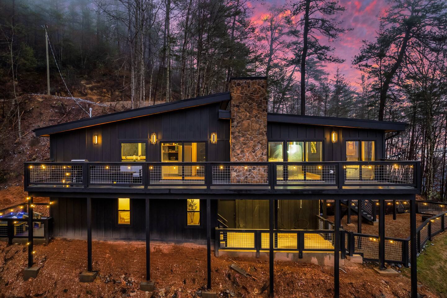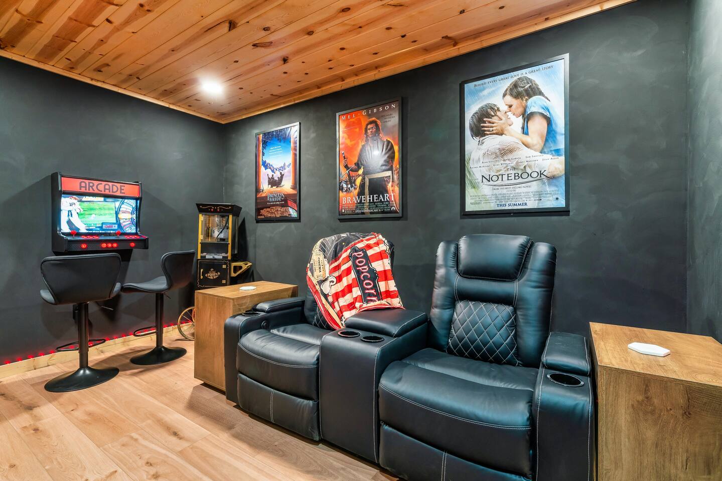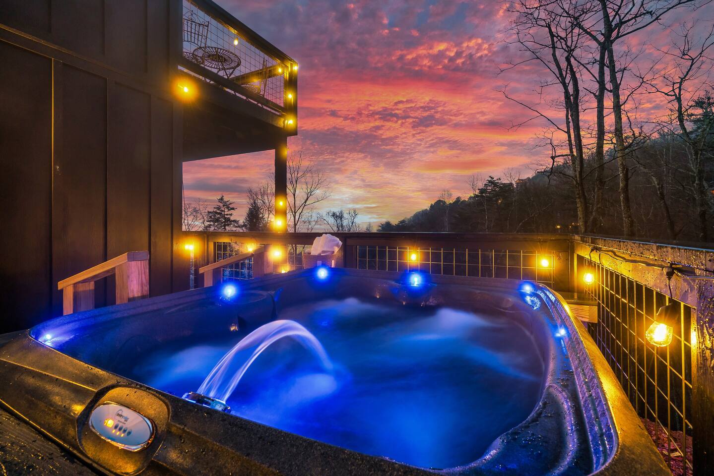 ❣️Eagles Nest❣️ is a NEW ✨luxury couple’s retreat✨ perched in the Smoky Mountains—designed for intimacy, romance, and unforgettable memories. With two levels of bliss, this cabin combines high-end finishes, breathtaking mountain views, and thoughtful touches to make your getaway truly special. ✨Main Level✨ Step into a chef-inspired kitchen with emerald green granite countertops, high-end appliances, and everything you need—from cooking utensils to baking sheets and storage containers—for crafting romantic meals together 🧑🏻🍳. The intimate dining area features a large bay window that opens fully on beautiful days, letting in fresh mountain air and the soothing sounds of nature. ✨Luxury Bedroom✨ is a lavish retreat designed for connection 💕. With a spa-like ensuite featuring a tile backdrop for the bed, dual vanities, and a closed-off toilet nook, this space radiates luxury. The centerpiece? A corner jacuzzi tub with full mountain views, perfect for soaking away your worries while reconnecting. The shower boasts entrances on both sides with dual shower heads for the ultimate couple’s experience 🚿. Additional touches include a full-length mirror, spacious closet, and a stackable washer/dryer for longer stays. Entertainment abounds with an automated 120" projector screen and smart projector streaming all your favorite shows🎬🍿 (Netflix included), while private deck access lets you enjoy the 30ft outdoor space complete with a telescope for stargazing, a propane fire feature with loveseat, dining area, and a grill for sunset BBQs 🌄🔥. ✨Lower Level✨ Descend the spiral staircase to the cozy living area featuring a floor-to-ceiling fireplace, comfy seating, and a reading nook perfectly positioned for Smoky Mountain views. Step outside to the hot tub with a built-in drink ledge, or relax on the covered patio with hanging chairs, a bench swing, and a wood-burning fire pit—ideal for starry night cuddles or roasting marshmallows ✨🌌. The lower level also houses your very own custom movie theatre 🎬 and arcade 🕹️, thoughtfully designed for couples. Enjoy luxury theater seats, an 85" Smart TV, electric fireplace, subwoofer, soundbar, and a popcorn machine with complimentary packs 🍿. The arcade lets you take a nostalgic stroll through 6,000+ games from classic consoles like Nintendo, GameCube, N64, PlayStation, and more 🎮. ✨Eagles Nest✨ isn’t just a cabin—it’s a mountain paradise for couples to unwind, reconnect, and create memories that last a lifetime 💕🏔️. Amenities Included: 🔥 Exterior Propane Burning Fireplace 🪵 Exterior Wood Burning Firepit 🔥 2x Interior Electric Fireplaces 🪑2x Hanging chairs 🛁 Outdoor Hot Tub 🛁 Indoor Jacuzzi Tub 🍔 BBQ 📺 2x Smart TV's 📺 120" projector screen with smart projector 🎬 Free access to Netflix 🕹️ Arcade for 2 with over 6,000 games 🍿Private movie theatre 🔊 Wi-Fi 🚿Dual Shower 🧴Shampoo, conditioner and body wash 👘 Bath Robes ☕️ Coffee Maker ♨️ Microwave 💆♀️ Hair dryer 🧺 Washer + dryer 🛏 Plenty of towels, blankets and pillows 🎲 Board Games + Puzzles ‼️ATTENTION‼️ Here is important information to enhance your stay. Prepare for a luxurious woodland adventure where you might encounter adorable critters 🐻🍃, and remember that you are surrounded by woods, so encountering harmless bugs 🪲 is inevitable. It is almost guaranteed you will see a bear, please lock your car doors and keep your distance. Using the hot tub is entirely at your own risk ⚠️. Smoking of any kind is strictly prohibited inside the property 🚭. If our cleaners detect any signs of smoking inside, a $500 fee will be charged. Please keep all smoking on the exterior away from entry ways. Please adhere to our check-in and check-out timings ⏰. Unauthorized early check-ins or late check-outs are prohibited and will incur additional charges. If the guest fails to vacate the property on time, a fee of $50.00 will be charged for the first half-hour and $100.00 for each subsequent half-hour. Due to Mother Nature's unpredictability 🌪️, we do not provide refunds for weather-related issues, natural disasters, power outages, or events beyond our control. We recommend getting travelers insurance. Although we love our furry friends 🐶🐱, we have a strict no-pets policy on the premises. If our cleaners discover any violation of this rule, you will be charged an additional cleaning fee of $500. An outdoor security camera 🎥 monitoring the driveway operates 24/7, recording movement and sound solely for safety reasons. Be reassured that there are NO indoor cameras or cameras pointing towards the front or back of the house, preserving your privacy.