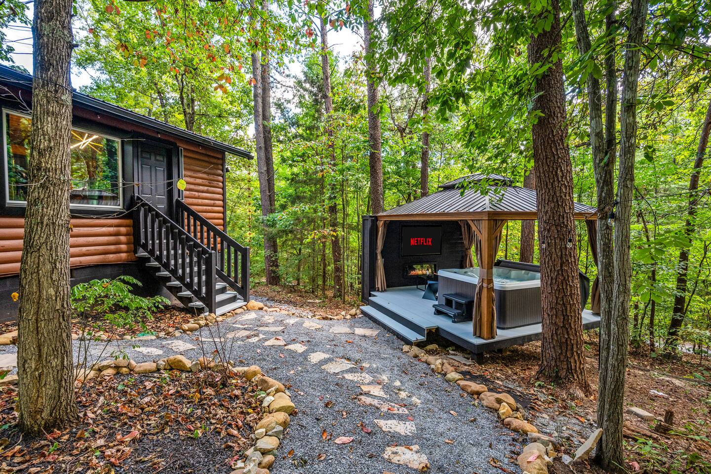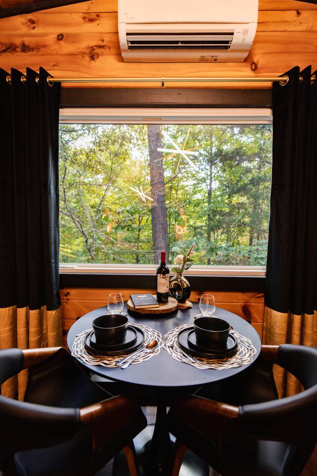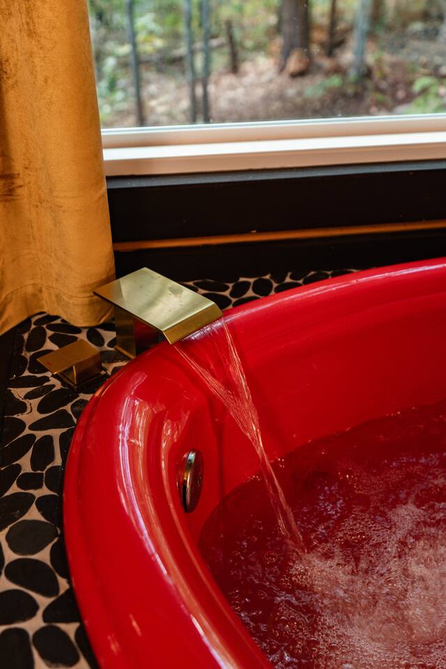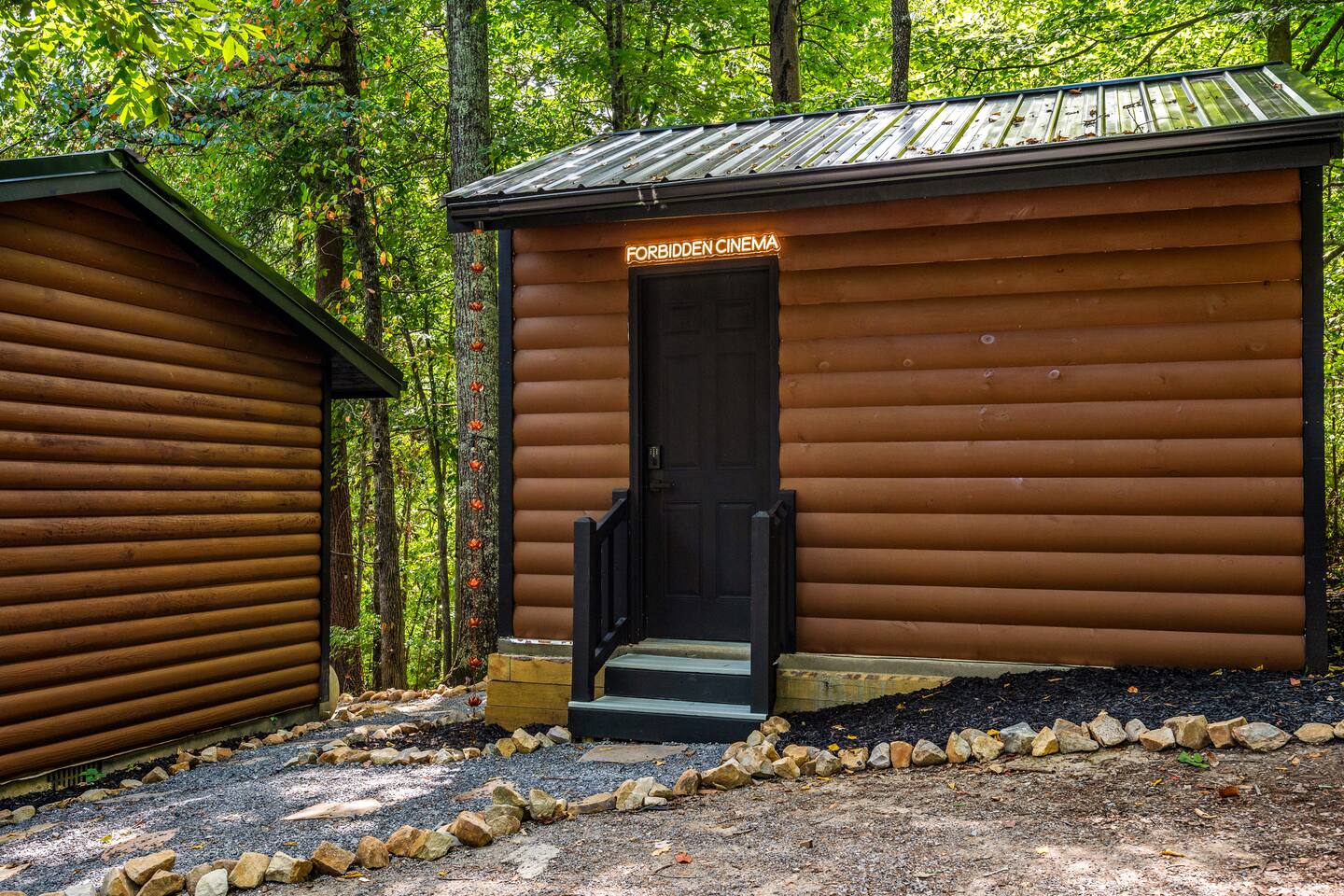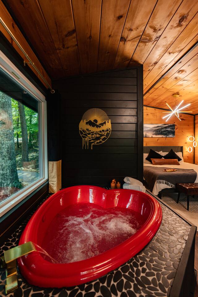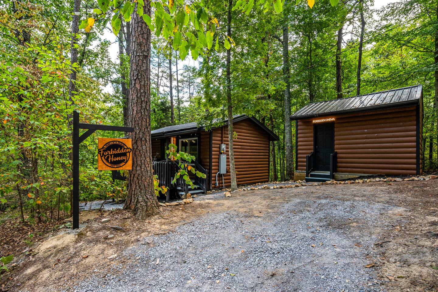 Welcome to Honey Mountain Resort, the perfect getaway for couples! Our five newly renovated luxury honeymoon cabins are thoughtfully designed to create an intimate and romantic atmosphere, ensuring you and your special someone can truly connect. Each cabin features its own private movie theater, hot tub pergola, fire pit, and convenient parking, allowing you to enjoy cozy evenings together under the stars. If your dream cabin is already booked, don’t worry—just click on my profile picture to explore our other enchanting options. We can’t wait to help you create unforgettable memories here at Honey Mountain Resort. Feel free to reach out with any questions; we’re here to assist you! The Forbidden Honey is a fully furnished 1 bed, 1 bath studio log cabin with a spacious yard that provides plenty of activities, such as: private theater room, personal hot tub pergola and fire pit. (All these amenities are for your exclusive use, NOT a shared space.) MAIN LIVING AREA: consists of a kitchen, dining table, 65” smart TV, propane fireplace, king bed, and a heart shaped jetted tub. KITCHEN: equipped with the essentials to cook a yummy meal, including a Keurig individual cup coffee maker with complimentary coffee pods. BATHROOM: fitted out with a large walk-in tile shower with dual shower head and complimentary shampoo, conditioner and body wash. You will also find cozy waffle bath robes for your comfort. FRONT DECK: you will find a gas fire table with comfy seating and a bbq. PRIVATE THEATER ROOM: can be found just steps from the front deck. The theater room consists of an 85” smart tv with a sound system, large chaise lounger, barstool eating table, electric fireplace, and popcorn machine. FIRE PIT: as you exit the cabin on the back side, you will find a lighted pathway that leads to a 2 seater bench swing with a fire pit, perfect for roasting some s’mores or just enjoying the nature! PERSONAL HOT TUB PERGOLA: as you continue down the lighted pathway, you will find a large pergola fitted out with a 65” tv, electric fireplace and private hot tub. Amenities Included: 🔥 Indoor Propane Fireplace 🪵 Wood Burning Fire Pit 🛁 Exclusive Outdoor Hot Tub 🫶🏼 Indoor Love Tub 🍔 BBQ 🔥Outdoor Propane Fire Table 📺 Smart TV 🎬 Free access to Netflix 🔊 WiFi 📽️ Private Theater Room 🚿Walk-in tile shower 🧴Shampoo, conditioner and body wash 👘 Bath Robes ☕️ Coffee Maker ♨️Microwave 💆♀️ Hair dryer 🛏 Plenty of towels, blankets and pillows