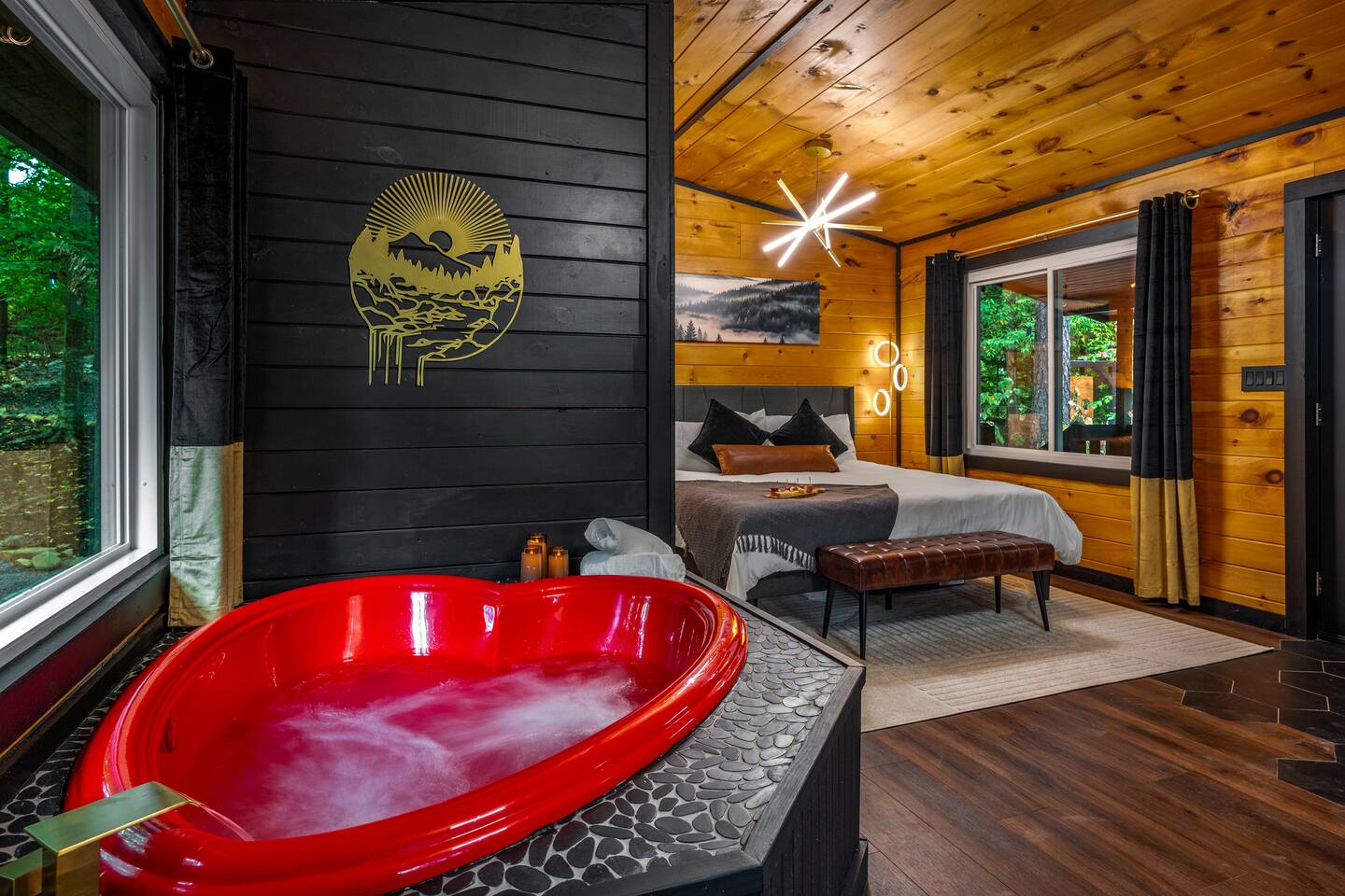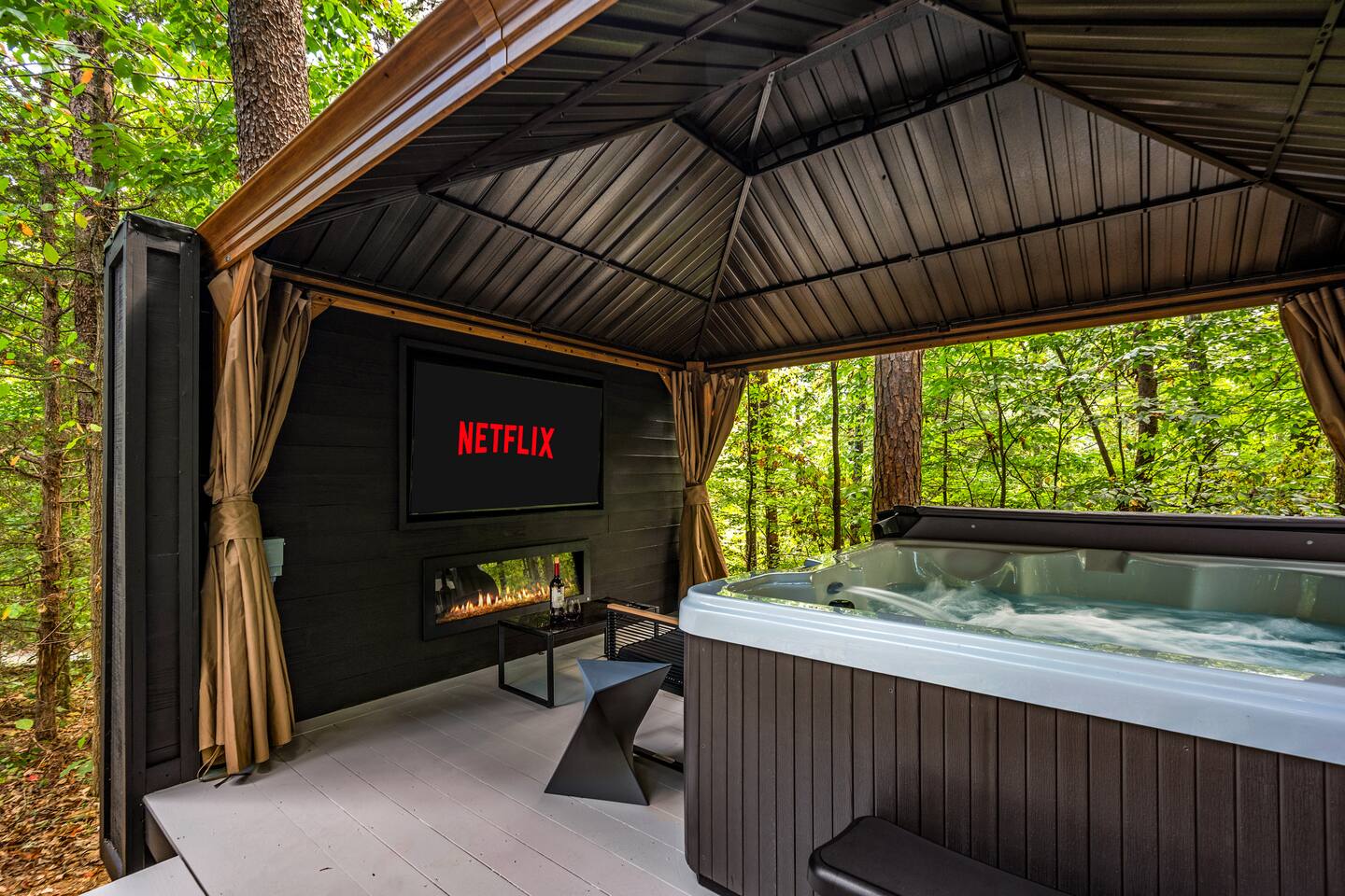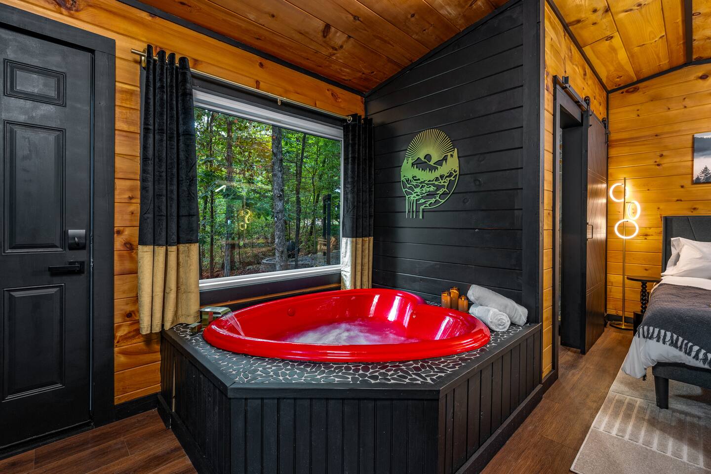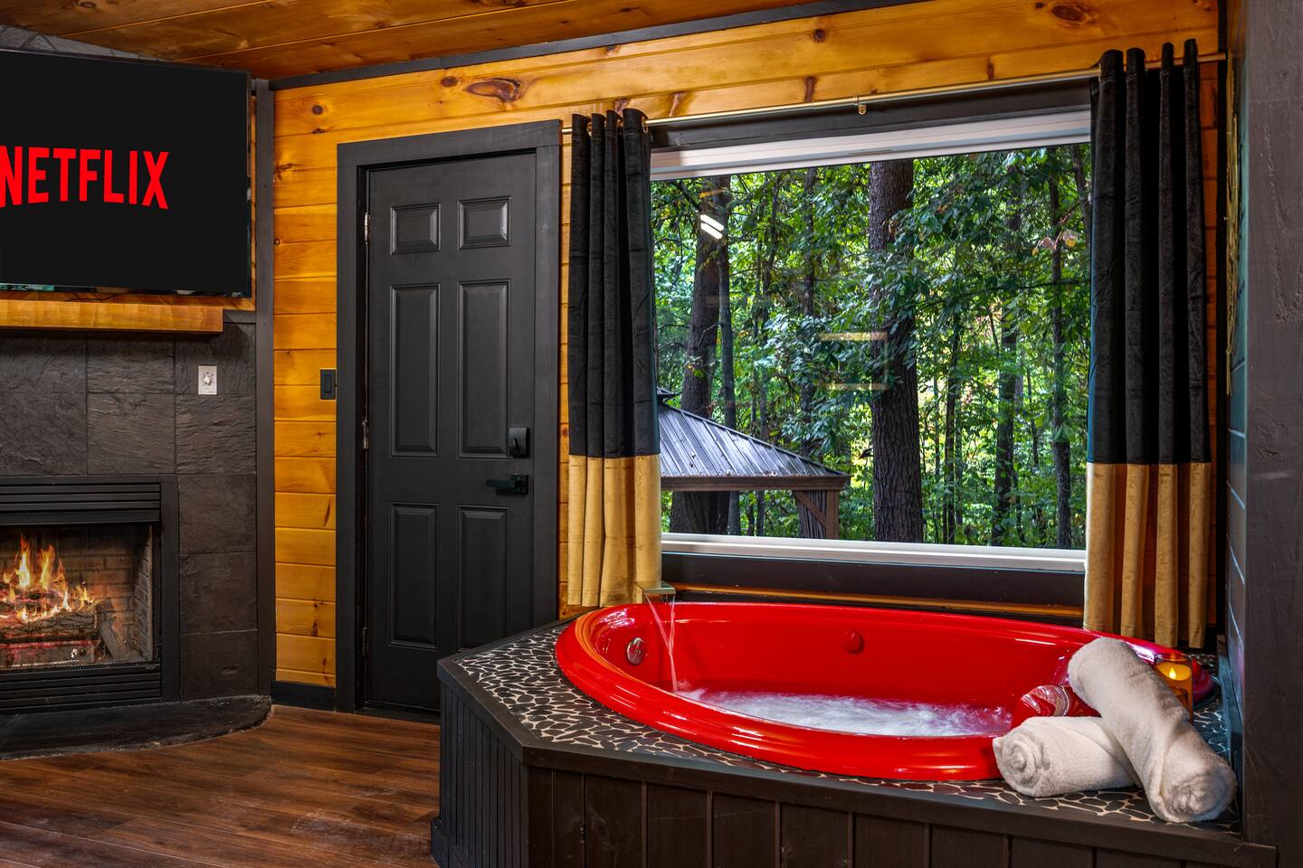 Welcome to Honey Mountain Resort, the perfect getaway for couples! Our five newly renovated luxury honeymoon cabins are thoughtfully designed to create an intimate and romantic atmosphere, ensuring you and your special someone can truly connect. Each cabin features its own private movie theater, hot tub pergola, fire pit, and convenient parking, allowing you to enjoy cozy evenings together under the stars. If your dream cabin is already booked, don’t worry—just click on my profile picture to explore our other enchanting options. We can’t wait to help you create unforgettable memories here at Honey Mountain Resort. Feel free to reach out with any questions; we’re here to assist you! The Forbidden Honey is a fully furnished 1 bed, 1 bath studio log cabin with a spacious yard that provides plenty of activities, such as: private theater room, personal hot tub pergola and fire pit. (All these amenities are for your exclusive use, NOT a shared space.) MAIN LIVING AREA: consists of a kitchen, dining table, 65” smart TV, propane fireplace, king bed, and a heart shaped jetted tub. KITCHEN: equipped with the essentials to cook a yummy meal, including a Keurig individual cup coffee maker with complimentary coffee pods. BATHROOM: fitted out with a large walk-in tile shower with dual shower head and complimentary shampoo, conditioner and body wash. You will also find cozy waffle bath robes for your comfort. FRONT DECK: you will find a gas fire table with comfy seating and a bbq. PRIVATE THEATER ROOM: can be found just steps from the front deck. The theater room consists of an 85” smart tv with a sound system, large chaise lounger, barstool eating table, electric fireplace, and popcorn machine. FIRE PIT: as you exit the cabin on the back side, you will find a lighted pathway that leads to a 2 seater bench swing with a fire pit, perfect for roasting some s’mores or just enjoying the nature! PERSONAL HOT TUB PERGOLA: as you continue down the lighted pathway, you will find a large pergola fitted out with a 65” tv, electric fireplace and private hot tub. Amenities Included: 🔥 Indoor Propane Fireplace 🪵 Wood Burning Fire Pit 🛁 Exclusive Outdoor Hot Tub 🫶🏼 Indoor Love Tub 🍔 BBQ 🔥Outdoor Propane Fire Table 📺 Smart TV 🎬 Free access to Netflix 🔊 WiFi 📽️ Private Theater Room 🚿Walk-in tile shower 🧴Shampoo, conditioner and body wash 👘 Bath Robes ☕️ Coffee Maker ♨️Microwave 💆♀️ Hair dryer 🛏 Plenty of towels, blankets and pillows